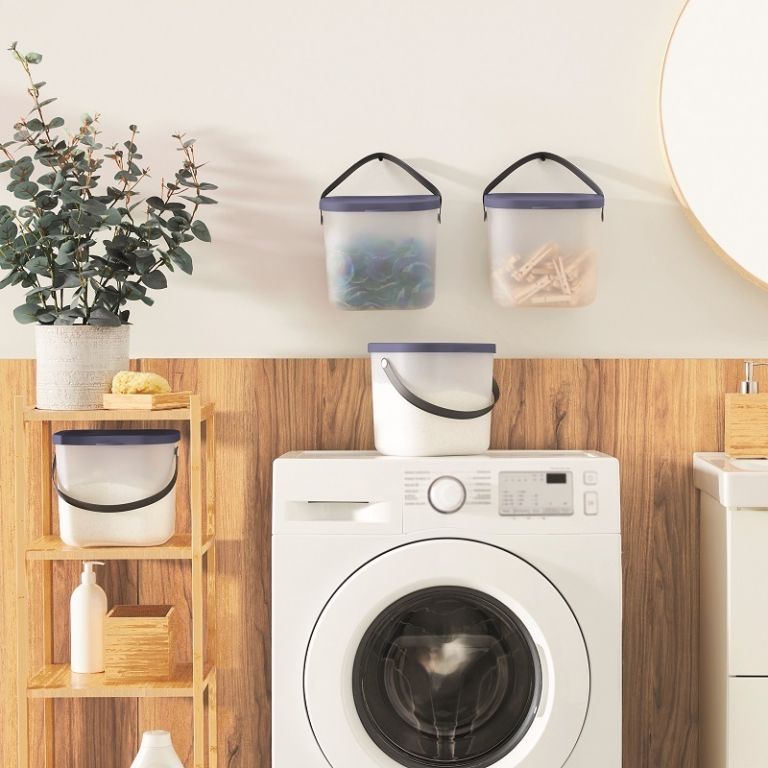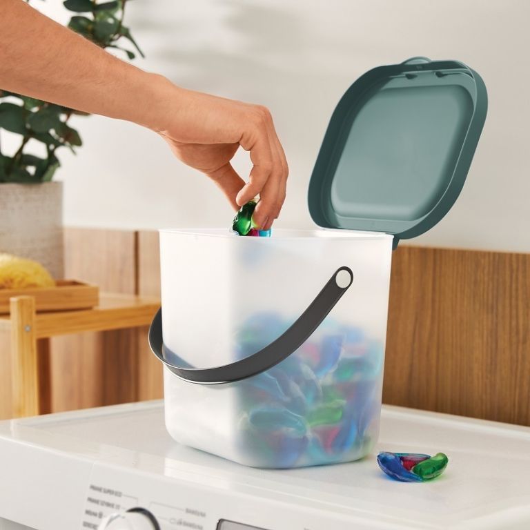 Menší box s víkem a madlem je ideálnína prací prášek, pro ukládání tablet do myčky nádobí a dalších drobných předmětů.