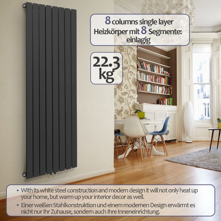 Moderní vertikální radiátor v elegantní antracitové barvě promění váš domov v útulné místo plné tepla a stylu. Díky svému designu se stane nejen praktickým zdrojem tepla, ale i výrazným prvkem každé místnosti. Vysoký výkon 1062 W zajistí příjemné klima i v chladných dnech.