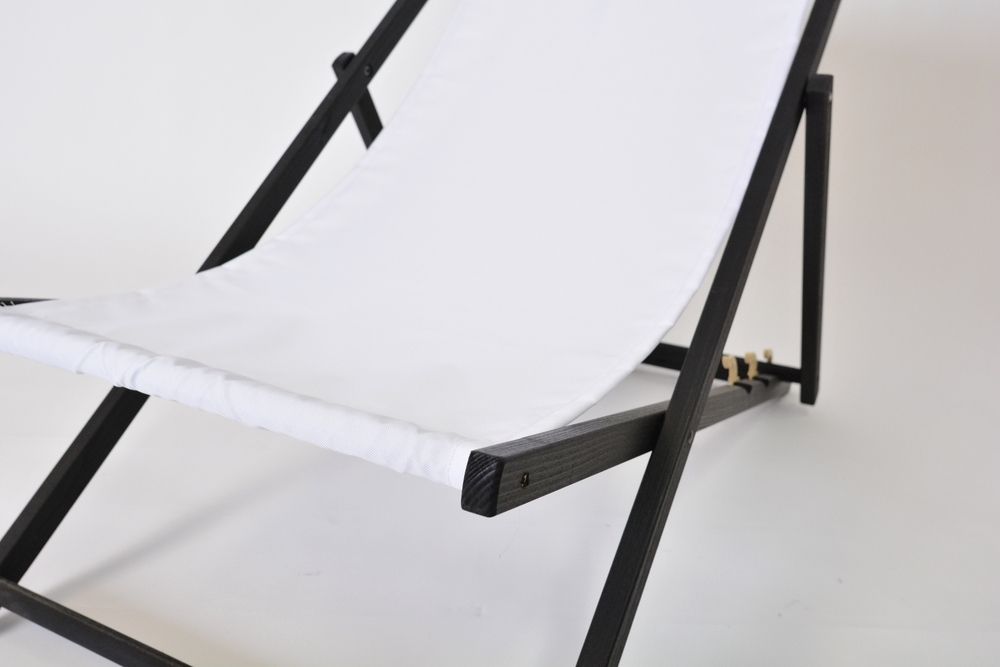Klasické, rozkládací, dřevěné lehátko. Jeho jedinečný design spočívá v elegantním spojení černě mořené konstrukce s jemnou bílou látkou sedáku, díky čemuž se odlišuje od ostatních.