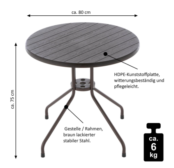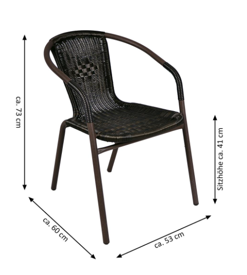 Židle ve stylu francouzských kaváren a bister jsou lehkým kusem sezení na váš balkon a zahradu, terasu nebo zimní zahradu a doplňuje je vkusný bistro stůl. Několik židlí tohoto typu můžete naskládat na sebe a ušetřit tak spoustu místa, pokud chcete sadu židlí uskladnit na zimní měsíce. Samozřejmě je můžete v případě potřeby použít i jako balkónové židle, zahradní židle nebo kempingové židle. Nohy židlí mají gumové výstupky / gumové krytky. Ty zabraňují klouzání, tlumí hluk při pohybu a chrání podlahu. Kulatý stůl s plastovou deskou v dřevěném designu je velmi stabilní a snadno se čistí. Montáž a demontáž je sama o sobě srozumitelná. To znamená, že balkonový stůl se po skončení sezóny může dokonce schovat do malých výklenků. Na oslavách dobře poslouží jako doplněk k zahradnímu stolu nebo jako odkládací stolek. Rám stohovací židle i zahradního stolu je vyroben z práškově lakované oceli s tesanou povrchovou úpravou. Tmavě hnědý polyratan, z něhož jsou vyrobeny židle, je odolný proti roztržení a má zajímavý výplet. Každá ratanová židle má celkové rozměry přibližně 73 x 53 x 60 cm, hmotnost přibližně 3,5 kg a sedák přibližně 42 x 38 cm. Stůl má průměr 80 cm a výšku přibližně 75 cm. Prohlédněte si také naši širokou nabídku dalších praktických zahradních potřeb, jako jsou skládací židle, stohovací židle, zahradní lavičky, slunečníky, stojany na slunečníky, stoličky, altány a mnoho dalšího.
