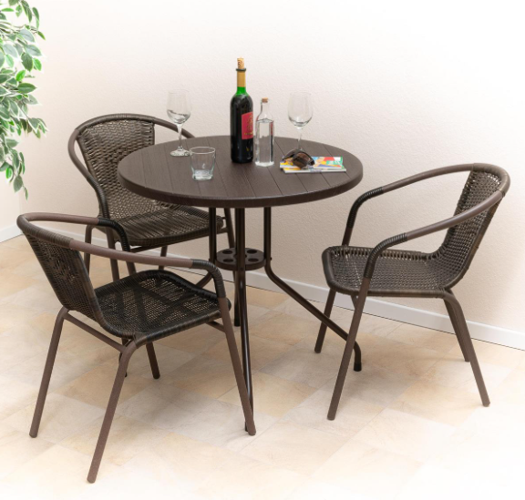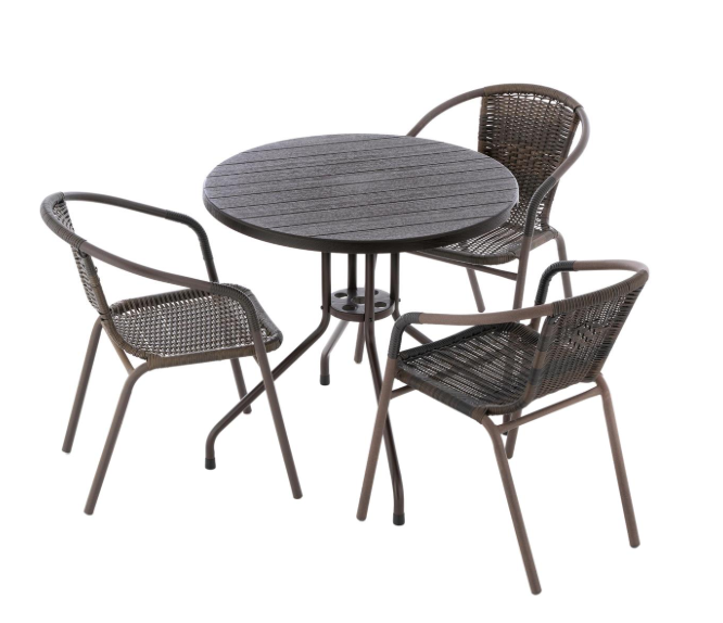 Jedná se o čtyřdílnou zahradní sadu, která se skládá ze tří židlí / stohovacích židlí a stolu pro skutečný středomořský nádech doma.