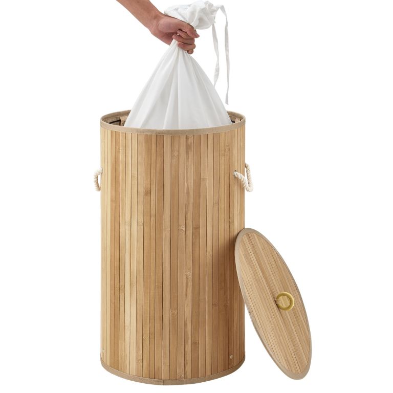 Bambusový koš na prádlo 55 l v kulatém designu s víkem a vakem zajistí hygienické a stylové uložení špinavého prádla.