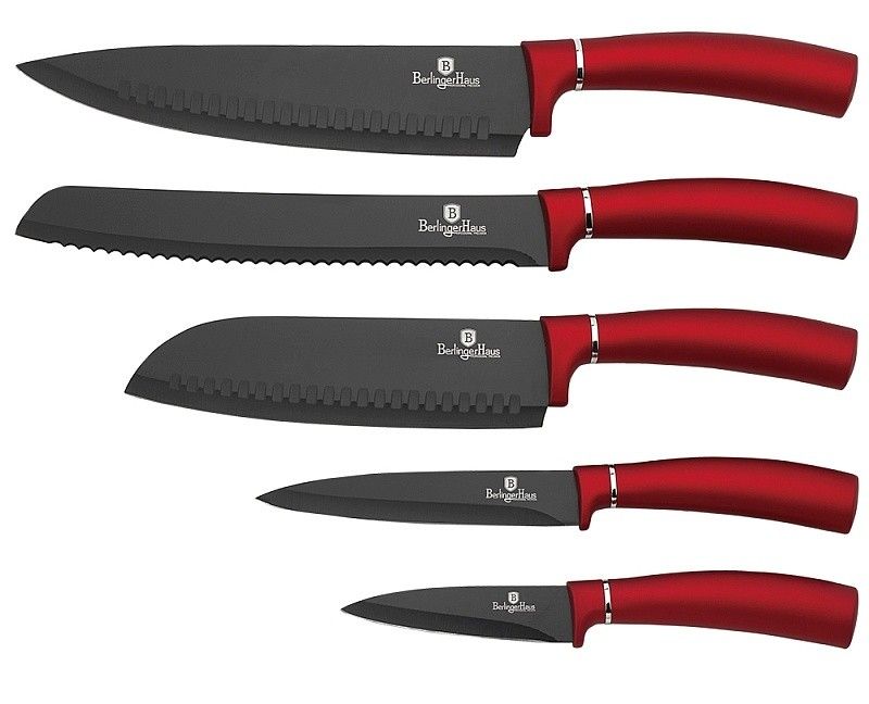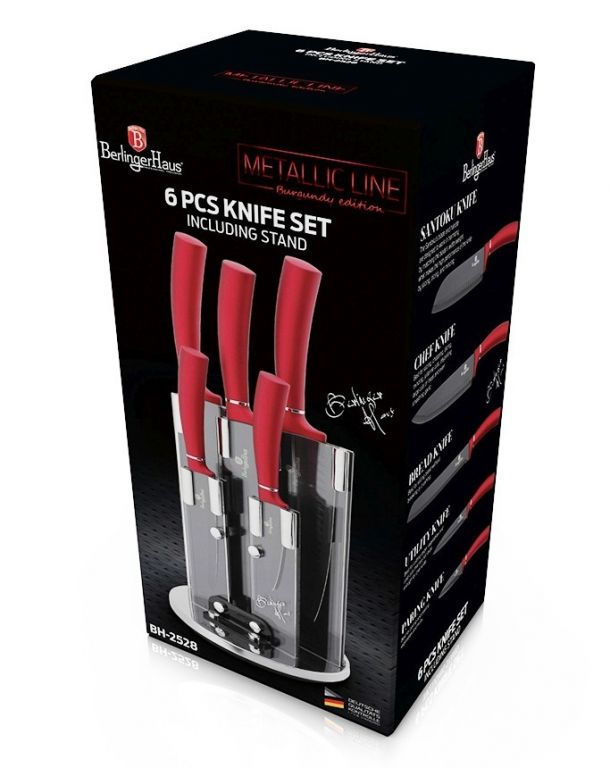 Sada nožů značky Berlingerhaus kolekce Burgundy Metallic Line. Obsahuje 5 nožů a praktický otočný stojan o 360°.