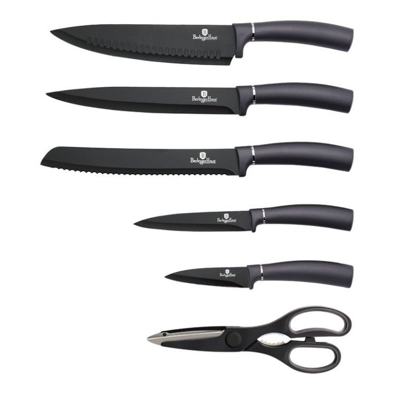 Kuchyšnké nože s nůžkami jsou vyrobené z nepřilnavé uhlíkové oceli s 18 % obsahem chromu a 10 % příměsí niklu. Použitá ocel přináší výborné vlastnosti tvrdosti, pevnosti a odolnosti proti opotřebení, takže vám bude náčiní sloužit o poznání déle. Zahrnuje nejčastěji používané pomůcky pro vaření a smažení, které budete mít vždy připravené po ruce. Nechybí zde 20 cm šéfkuchařský nůž, 20 cm nůž na pečivo, 17,5 cm japonský nůž Santoku, 12,5 cm univerzální nůž, 9 cm loupací nůž, kuchyňské nůžky a kulatý stojánek pro úhledné uložení.