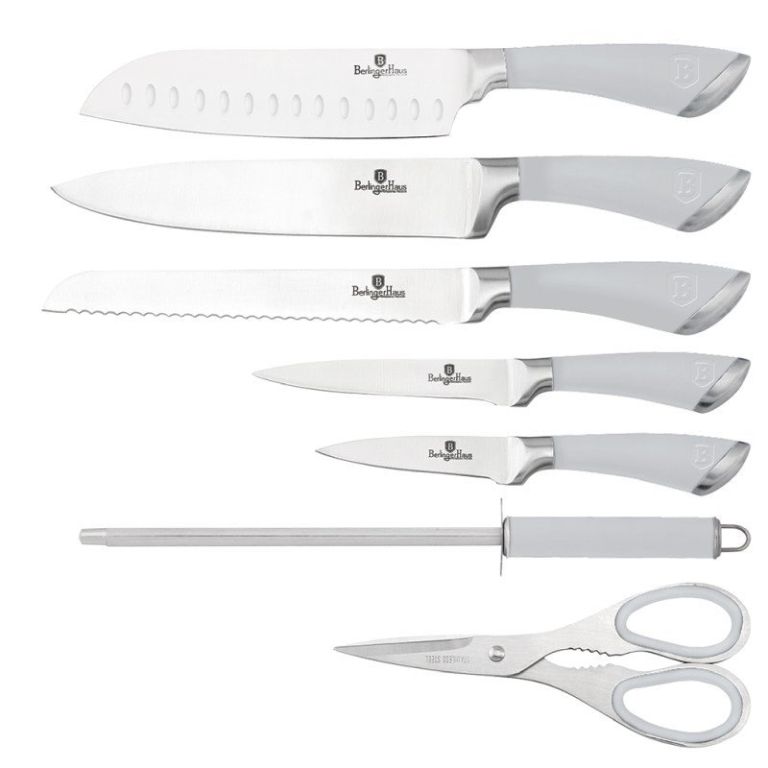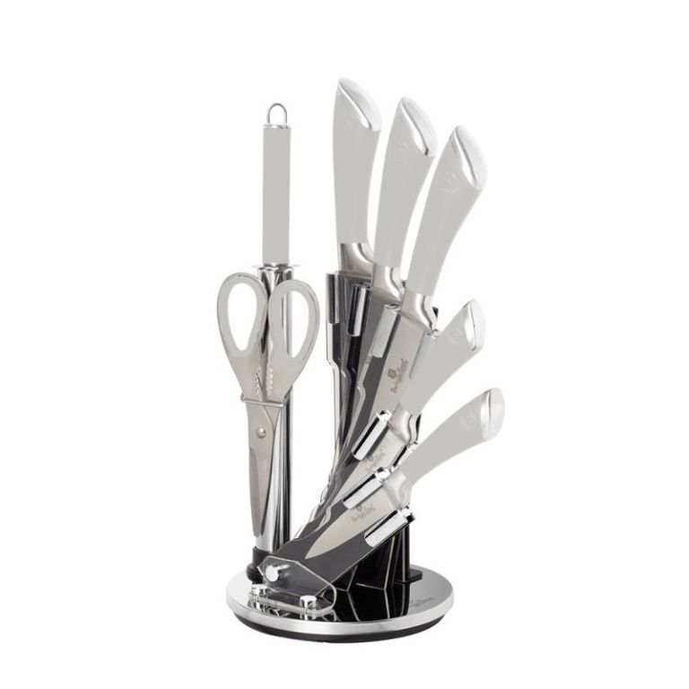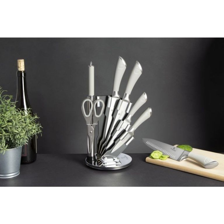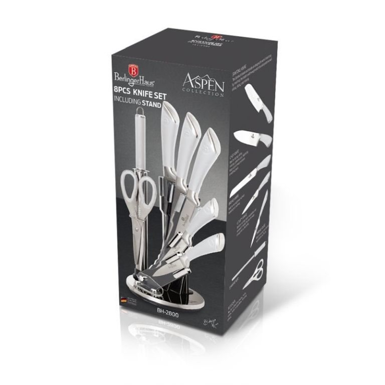 Sada Berlingerhaus Aspen Collection se skládá z 8 kusů kuchyňského náčiní. V balení najdete nože, ocílku, nůžky a praktický akrylátový stojan, který můžete otočit o 360°. Čepel nožů se vyrábí z nerezové oceli a je precizně broušená laserem. Každá čepel dokonale pasuje do stojanu. Využijete ho pro skladování nožů na kuchyňské lince. Neustále je tak budete mít po ruce.