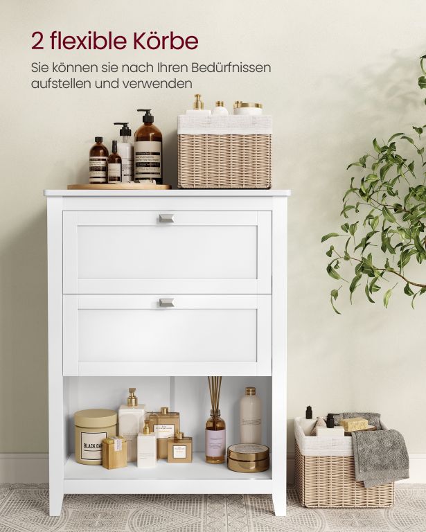 Vneste do své koupelny svěží eleganci a pořádek díky této stylové skříňce v oblaku bílé barvy. Dva prostorné šuplíky, otevřená přihrádka a dva košíky z umělého ratanu vám umožní mít vše potřebné vždy po ruce. Skříňka je ideální nejen do koupelny, ale i do předsíně či ložnice – zkrátka všude tam, kde potřebujete více úložného prostoru.