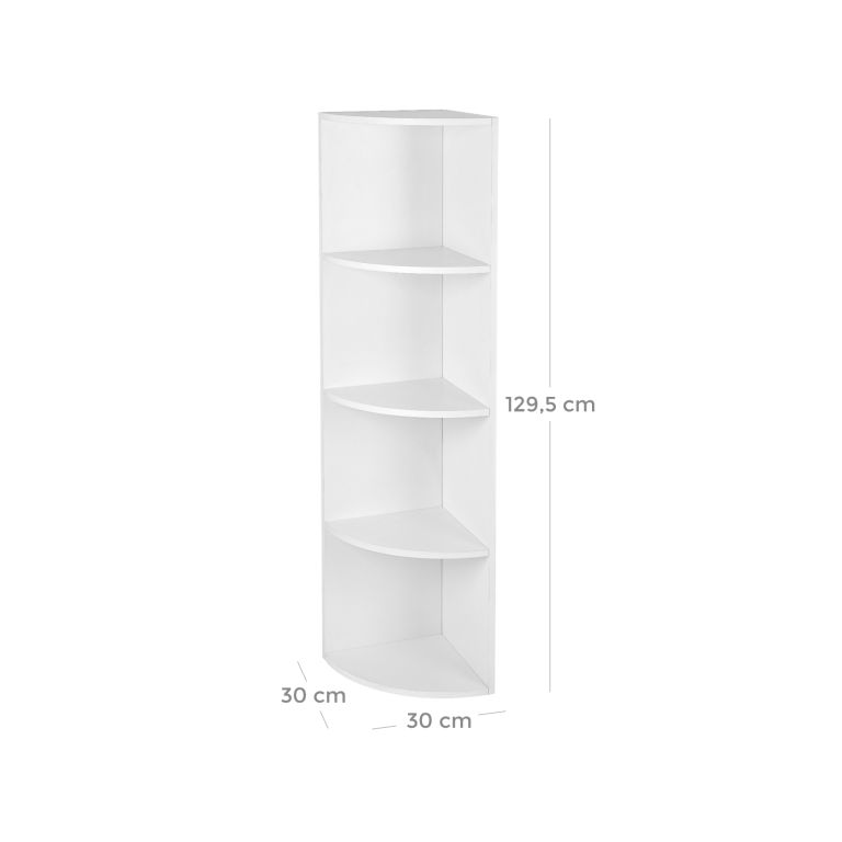 Bílá rohová police, 4 patra, 129,5x30x30 cm