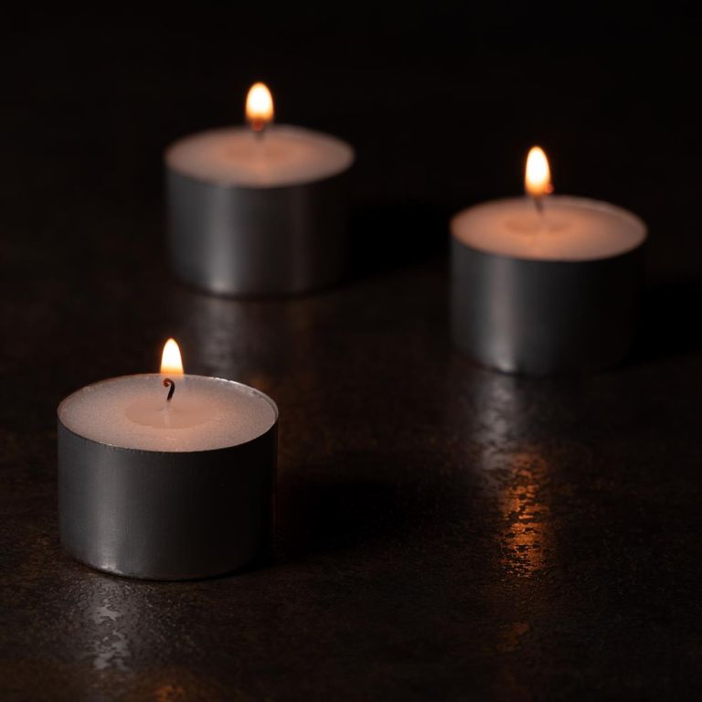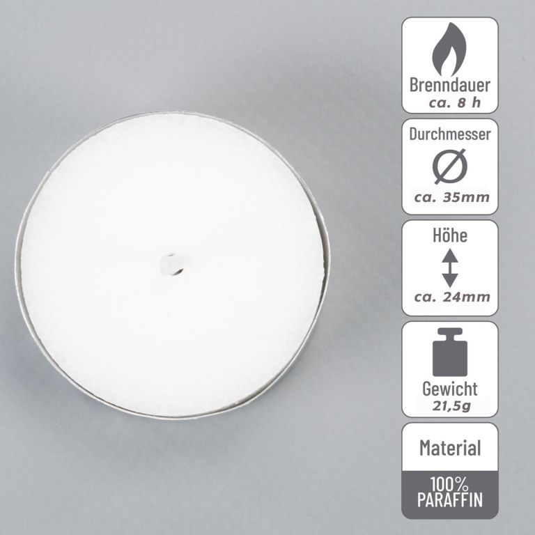Praktické čajové svíčky – 100 bílých svíček v hliníkových kalíšcích, 8hodinová výdrž, bez parfému. Ideální pro domácí pohodu i speciální události.