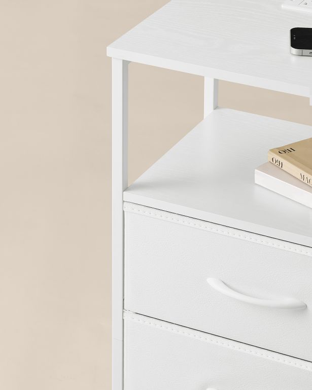 Stolek je vyroben z odolné oceli, MDF a dřevotřísky, což zaručuje stabilitu a dlouhou životnost. Snadná montáž díky přiloženému návodu. Dvě zásuvky a otevřená police poskytují dostatek prostoru pro vše potřebné. Údržba je jednoduchá, stačí otřít vlhkým hadříkem.