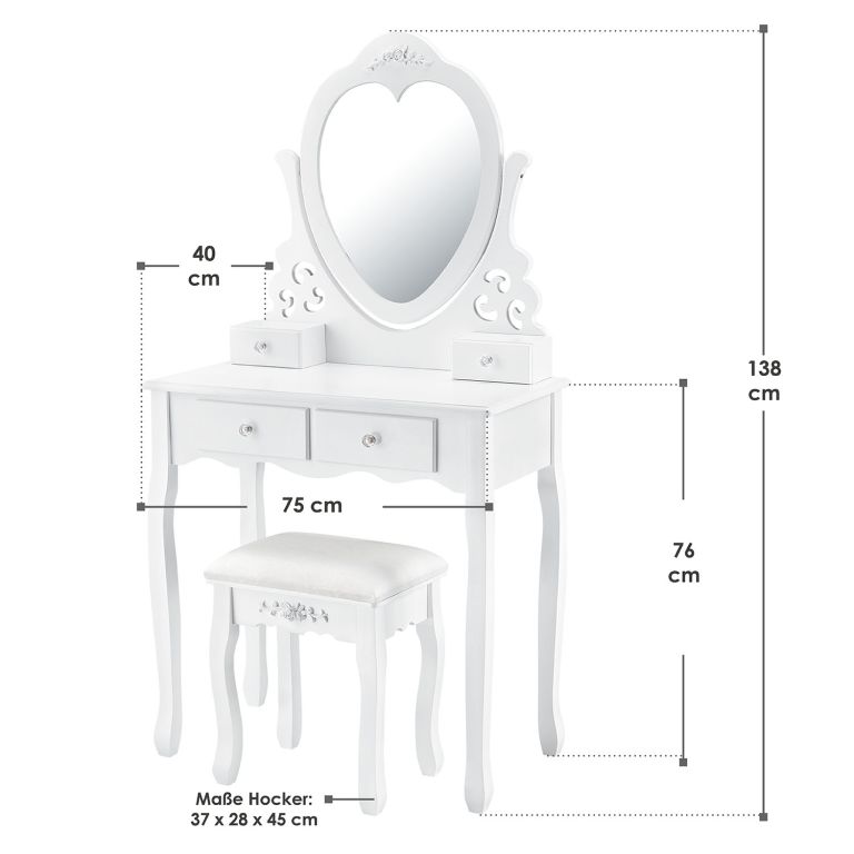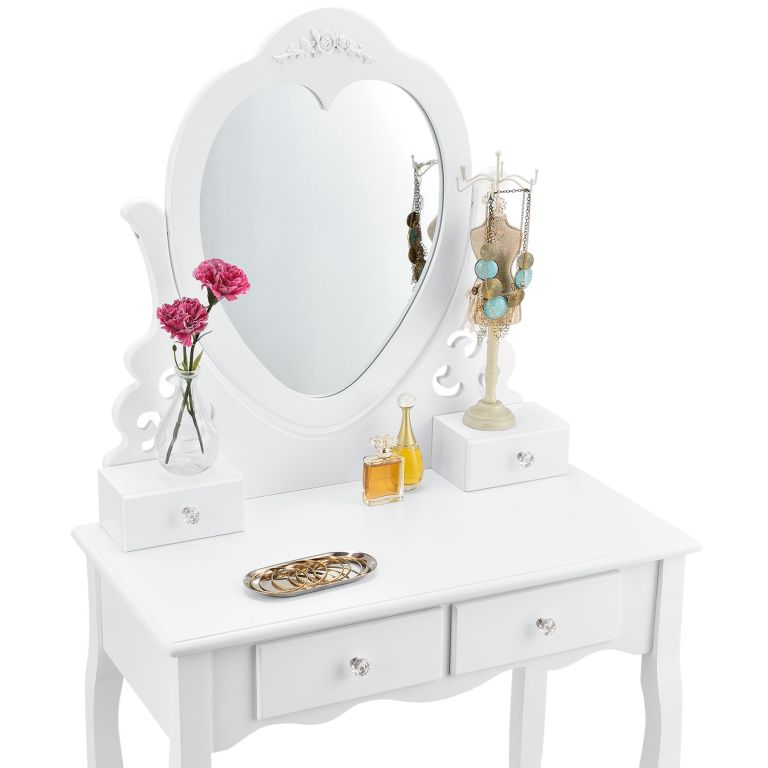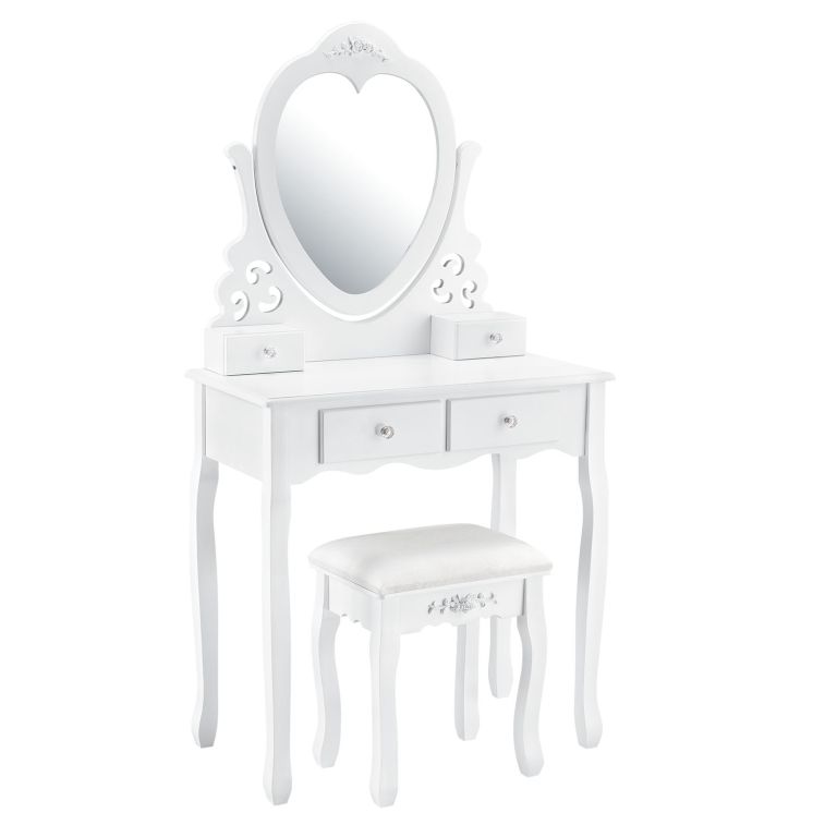 Elegantní kosmetický stolek Julia srdce, čtyři zásuvky a pohodlný taburet. Pro stylové líčení i úpravu vlasů.