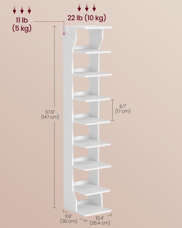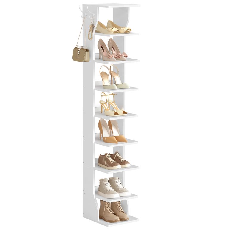 Proměňte chaos v předsíni v dokonalý pořádek díky úzkému botníku s devíti policemi. Elegantní bílý design skvěle zapadne do každého interiéru a praktické háčky vám umožní mít klíče či kabelku vždy po ruce.