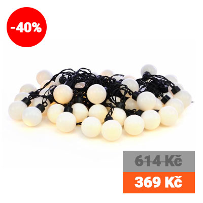 Když už pořáte venkovní párty, rozhodně nesmíte zapomenout na zahradní párty osvětlení. LED řetěz se 40 s velkými (průměr 4 cm), teple bílými žárovkami vykouzlí krásnou atmosféru. Celková délka řetězu včetně napájecího kabelu činí 22 m, takže osvětlením hravě pokryjete i větší plochy. Toto osvětlení bylo testováno na bezpečnost (GS) a jeho třída krytí je IP 44 – vhodné pro venkovní použití.