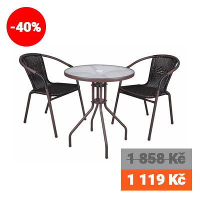 Dalším top produktem, který si také již našel mnoho spokojených zákazníků, je bisto stolek se skleněnou deskou a dvě židle z polyratanu Garth. Tento set je velice elegantní a díky použitým materiálům se vyznačuje velice dlouhou životností bez nutnosti údržby. Skleněná deska stolu je vybavena otvorem pro slunečník a židle jsou lehké, přesto velice stabilní.