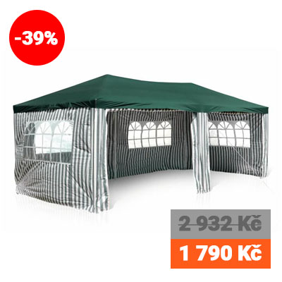 Chystáte se uspořádat zahradní párty či jakoukoliv venkovní oslavu? Pak rozhodně nepřehlédněte zahradní párty stan o rozměrech 3 x 6 m v jedinečném, velice stylovém, designu. Konstrukce z ocelových trubek zajišťuje vysokou stabilitu a průchozí výška 1,97 m maximální pohodlí pro hosty vaší venkovní akce. Plachta je vyrobena z odolného materiálu PE 110 g/m2.