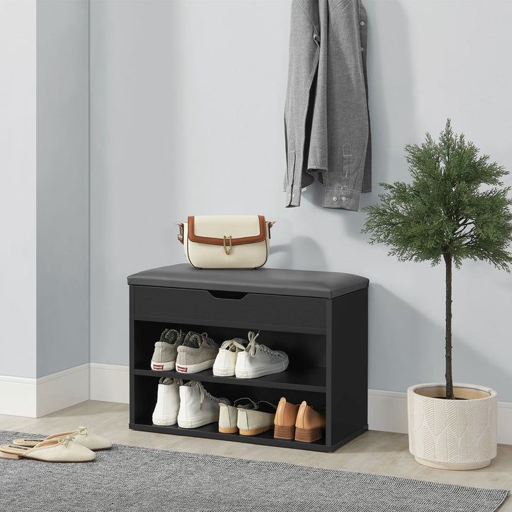 Praktický botník s polstrovaným sedákem, úložným prostorem a nosností 150 kg. Ideální do předsíně.