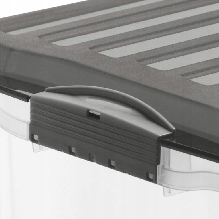 Úložný box o objemu 70L. Transparentní box + růžové víko. Víko je opatřeno klipy.