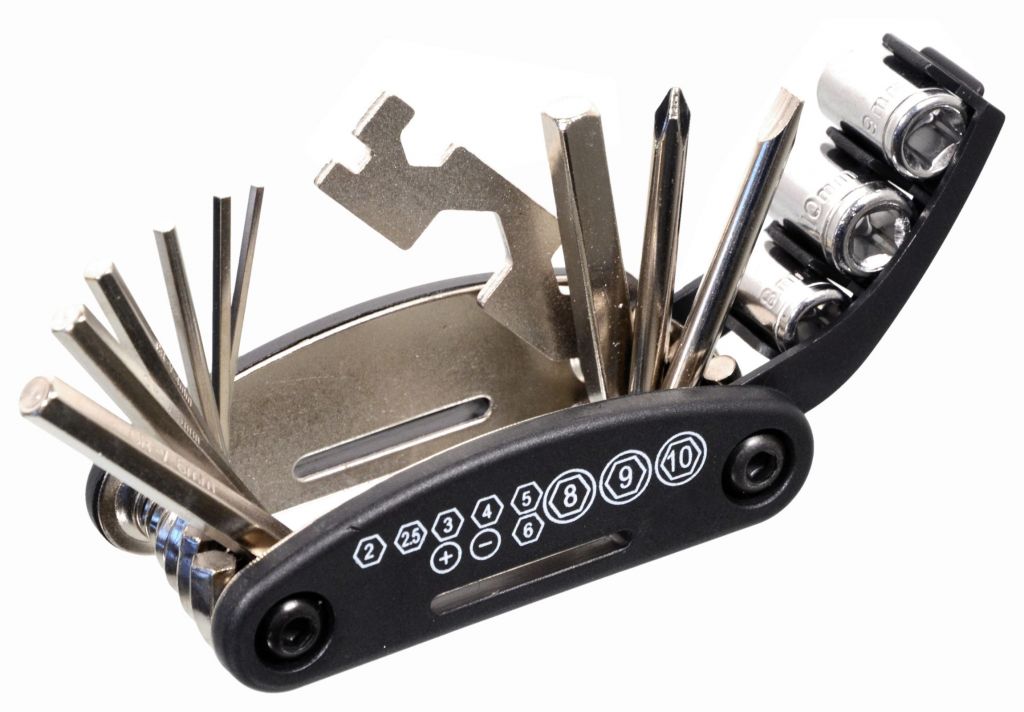 Praktická multifunkční souprava cyklistického nářadí a pomůcek pro opravu duší v praktické, uzavíratelné brašně.