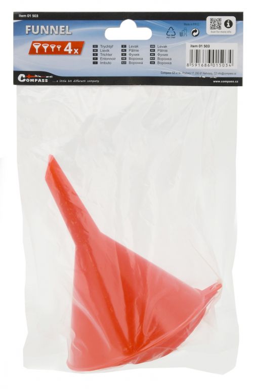 Univerzální 4 dílná sada trychtýřů pro přelévání kapalin. Jendotlivé kusy jsou opatřeny očkem pro možnost zavěšení a jsou rozměrově odstupňovány pro nejrůznější použití. V sadě jsou trychtýře o průměrech 52 - 118 mm s celkovou výškou 80 - 150 mm.