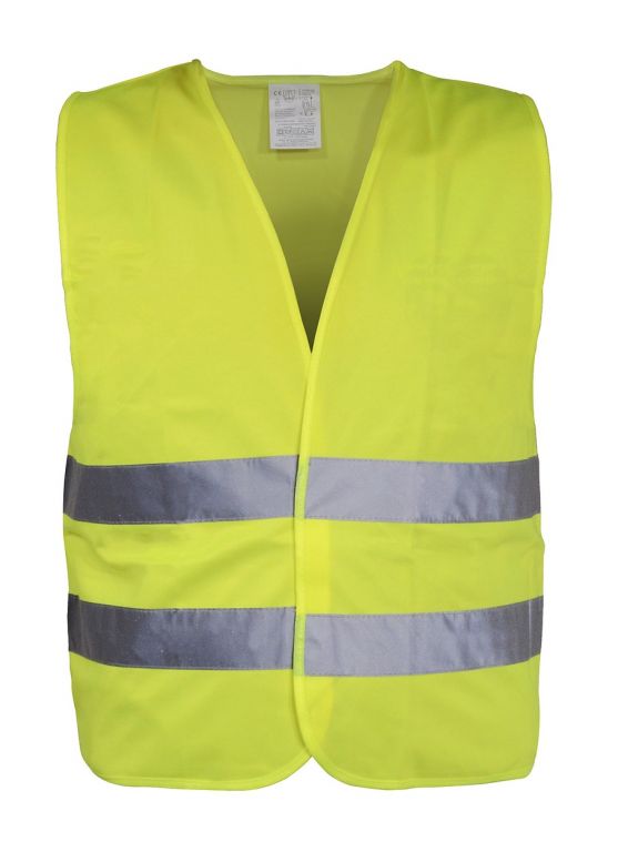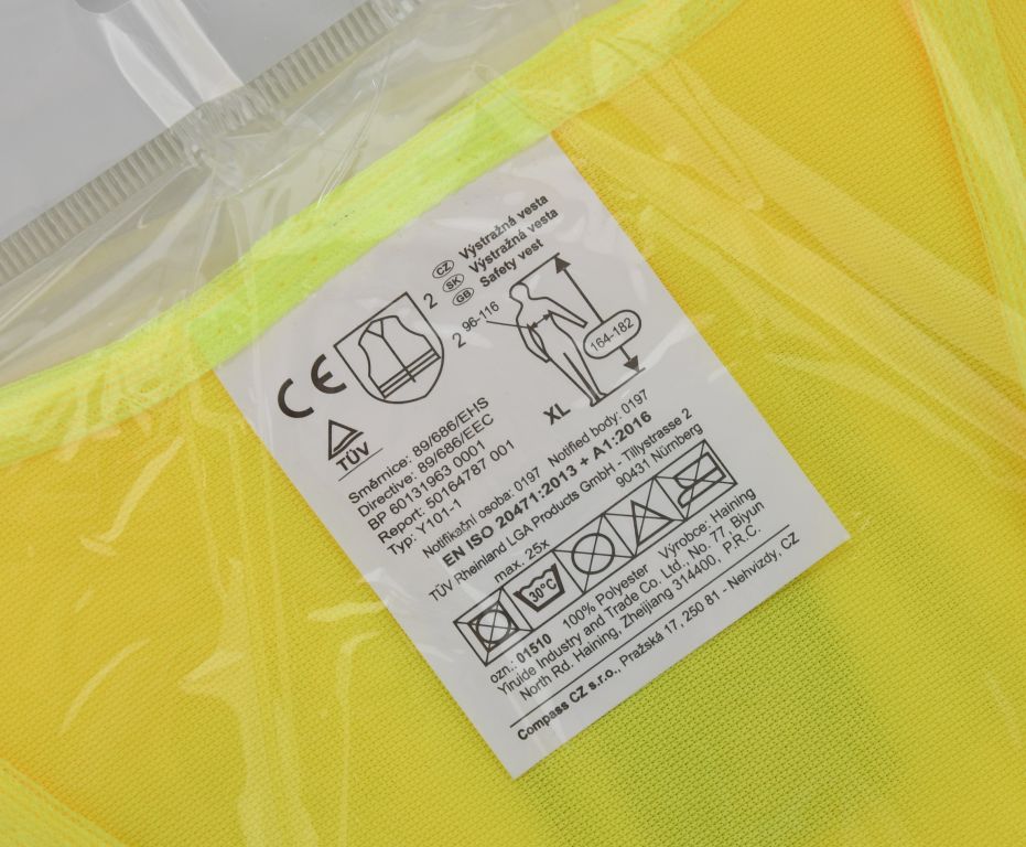 Výstražná reflexní vesta se zapínáním na suchý zip a dvěma reflexnímy pruhy po celém obvodu. Vesta se obleče na stávající oděv tak, aby žádná její část nebyla překryta jinými částmi oděvu a na přední straně se zapne pomocí suchého zipu.