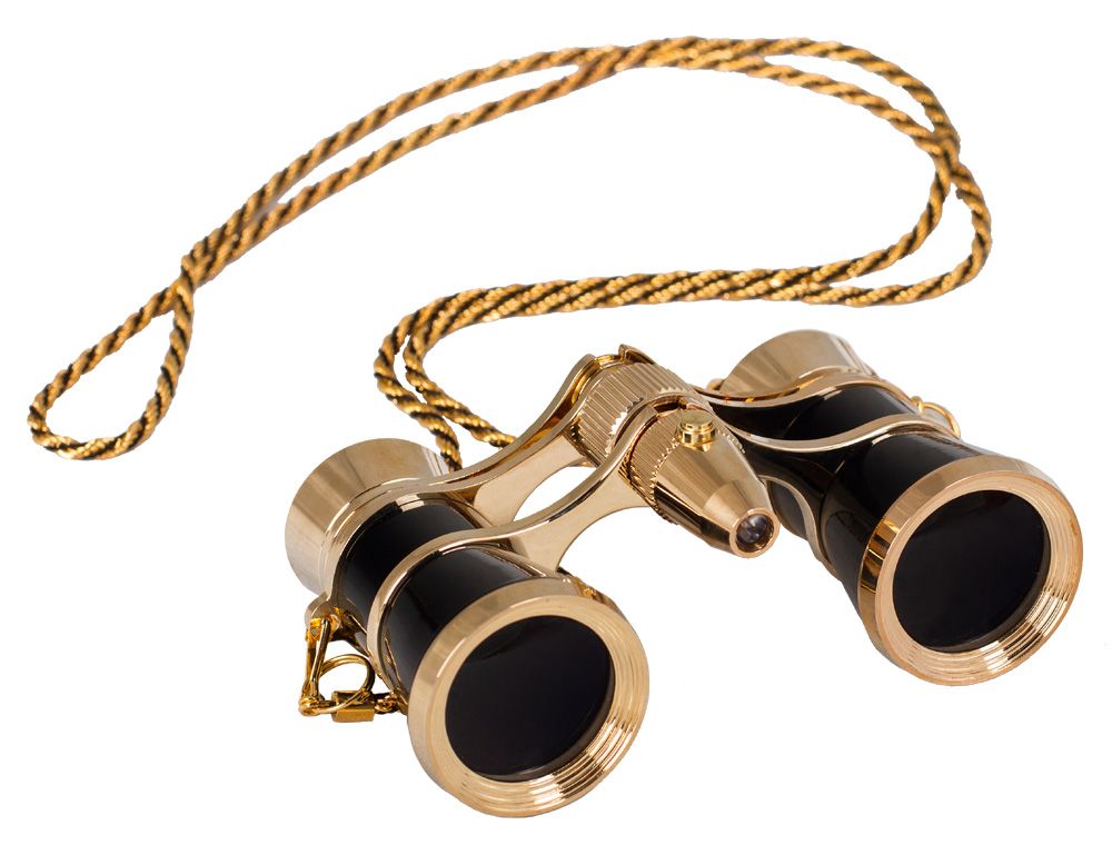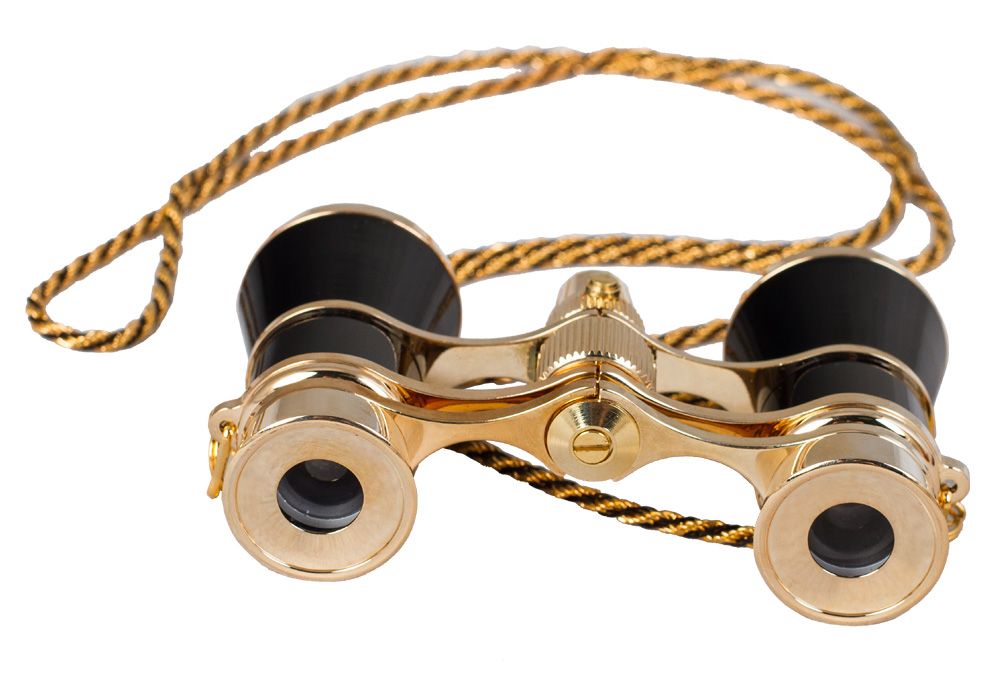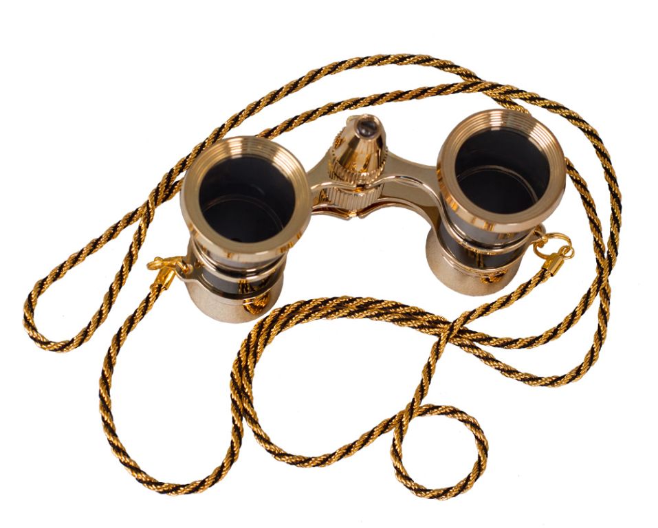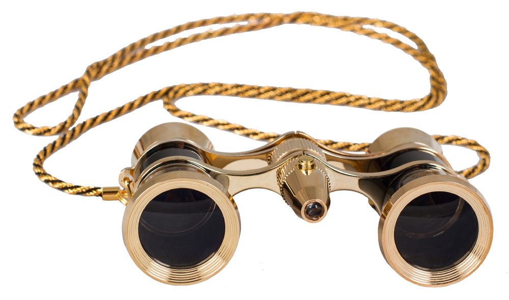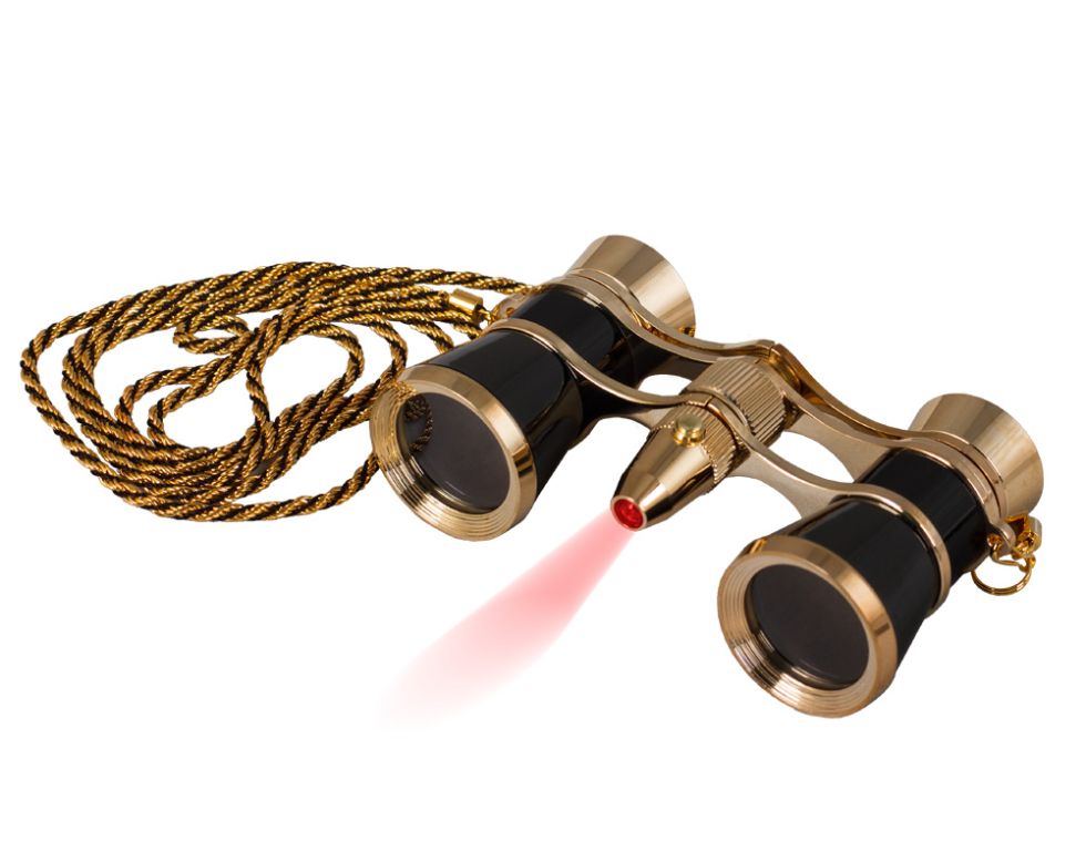 Elegantní divadelní kukátko s LED osvětlením. Triedr je opatřen tenkým kovovým řetízkem. Dodává se s váčkem pro uložení a čisticí utěrkou na optiku.