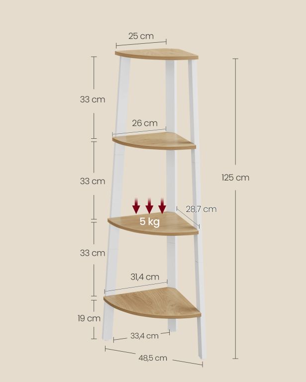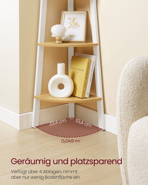 Moderní rohová police v kombinaci přírodního dubu a matně bílé oceli nabízí elegantní řešení pro každý interiér. Čtyři odkládací patra vytvoří krásný prostor pro vaše knihy, květiny, dekorace nebo praktické drobnosti do každé místnosti. Díky třínohému provedení a nastavitelné zadní nožce stojí stabilně i na mírně nerovných podlahách, zatímco bezpečnostní anti-tip sada brání nechtěnému převrácení.