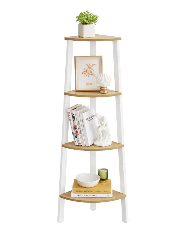Stylová čtyřpatrová rohová police v dubu a bílé barvě vám pomůže využít prostor na maximum a krásně vystaví dekorace, knihy i rostliny.