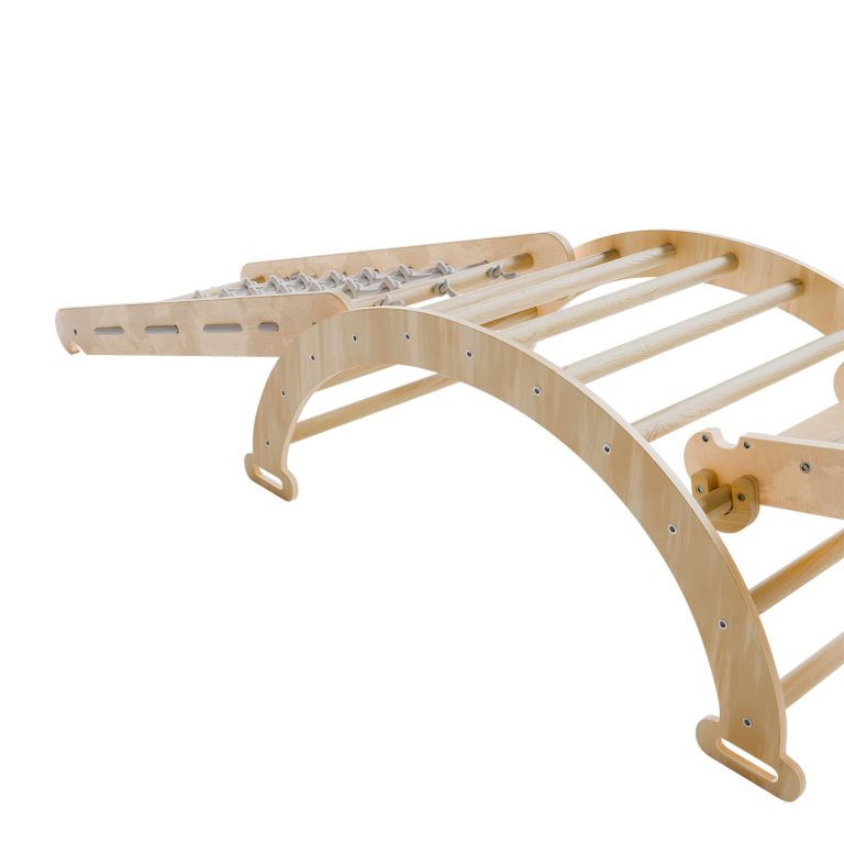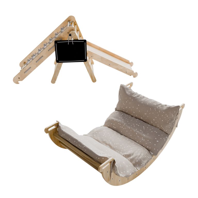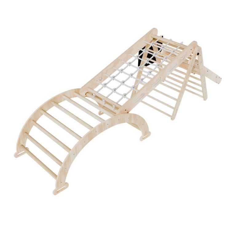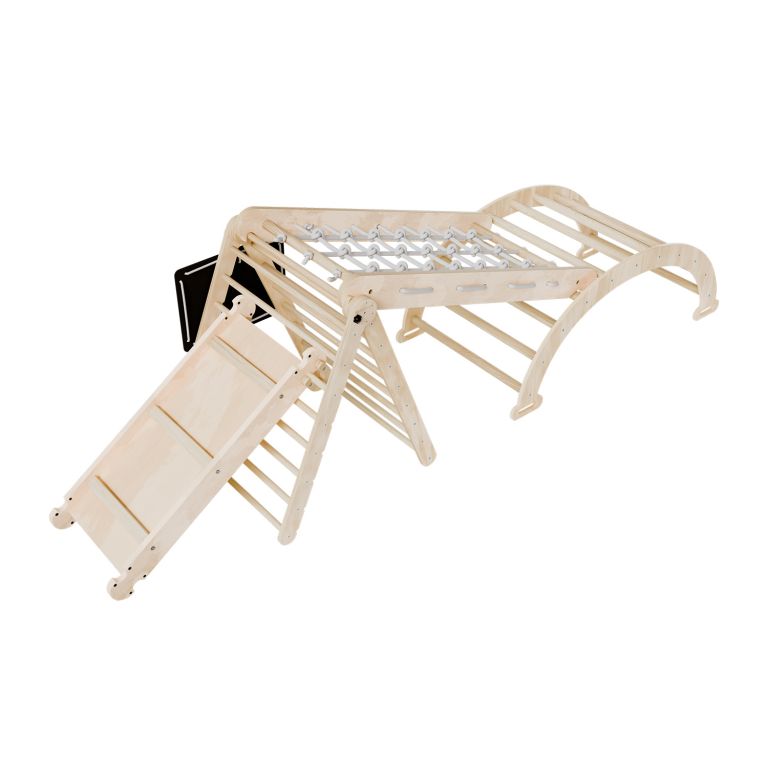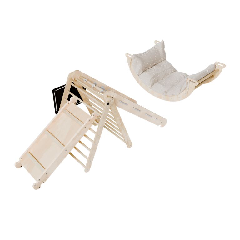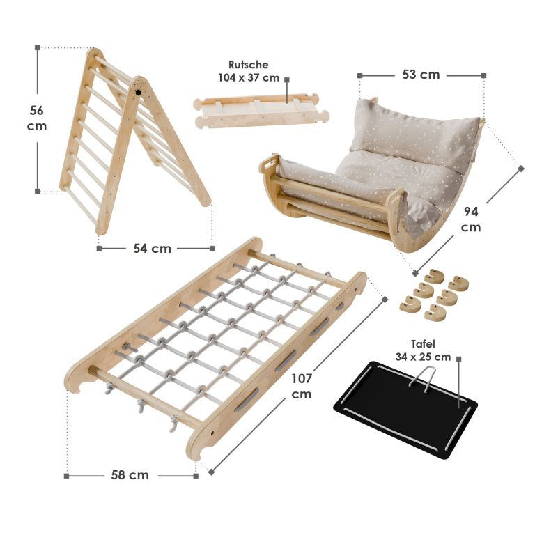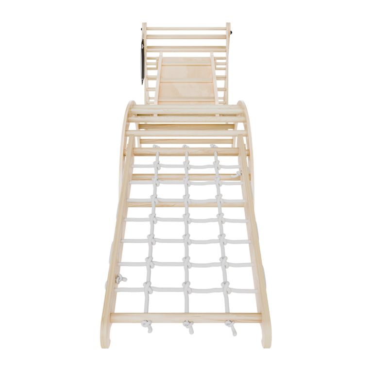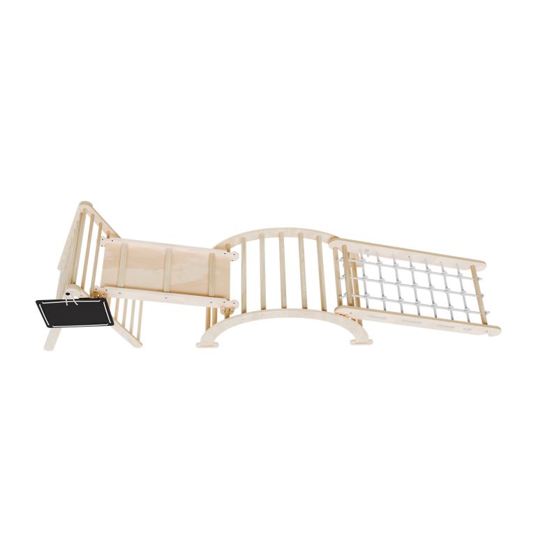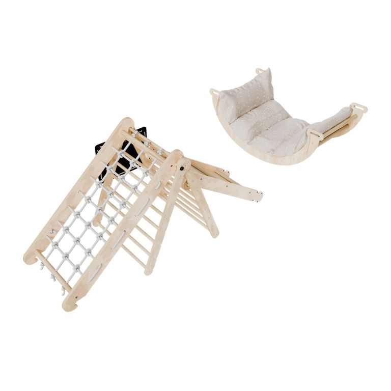 Celá sestava je z přírodního borovicového dřeva a překližky, takže působí odlehčeně, ale přitom vydrží opravdu hodně – každý prvek unese až 50 kg. Díly lze různě přestavovat a kombinovat, takže se snadno přizpůsobí místu i tomu, co děti zrovna baví. Houpačka s polštářem se postará o odpočinek po hraní, síť láká k lezení zase trochu jiným způsobem a tabulka rozvíjí fantazii i klidnější část hry. Aby byla zábava ještě bezpečnější, vyplatí se umístit pod sestavu měkkou podložku.