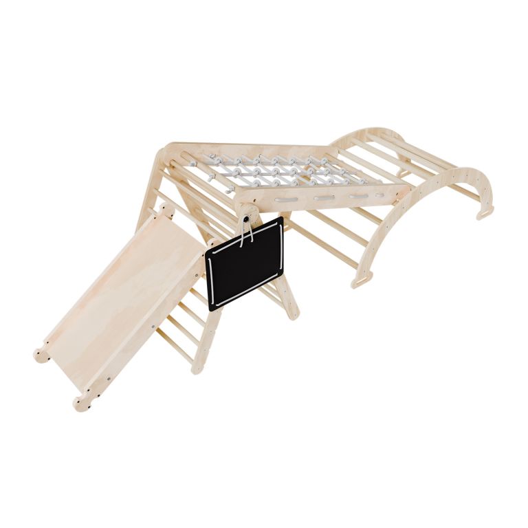 Kompletní herní sestava pro děti: skluzavka, houpačka, trojúhelník, síť i tabulka na kreslení. Podporuje pohyb, rovnováhu, tvořivost a fantazii dětí.