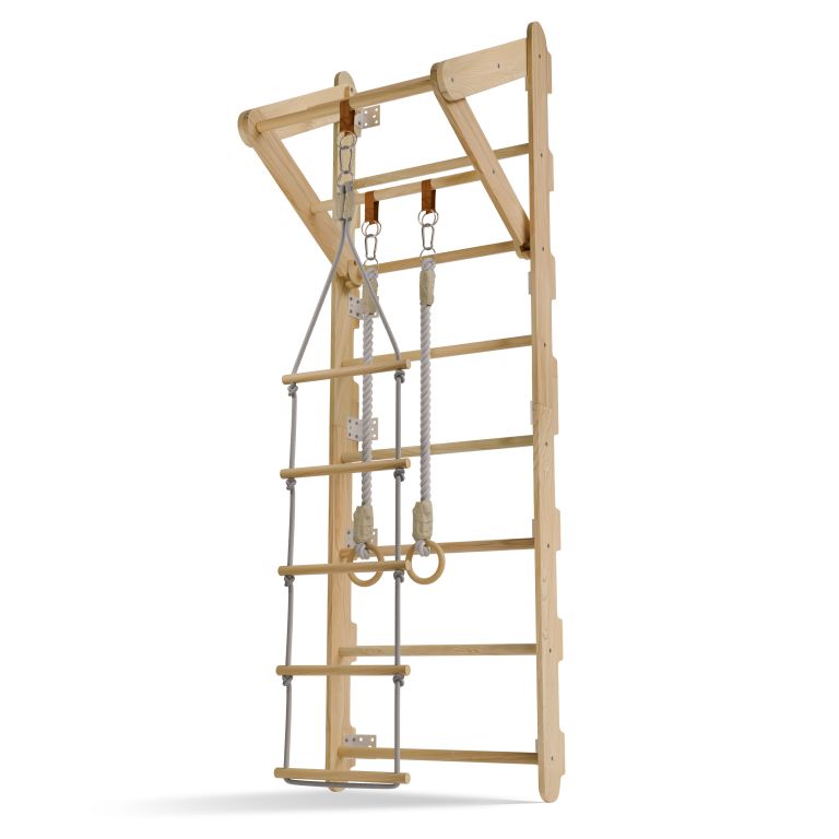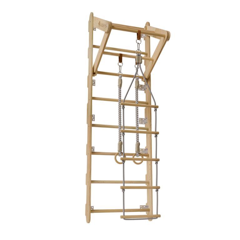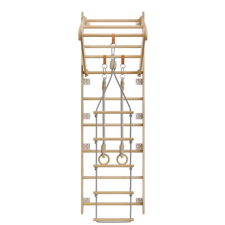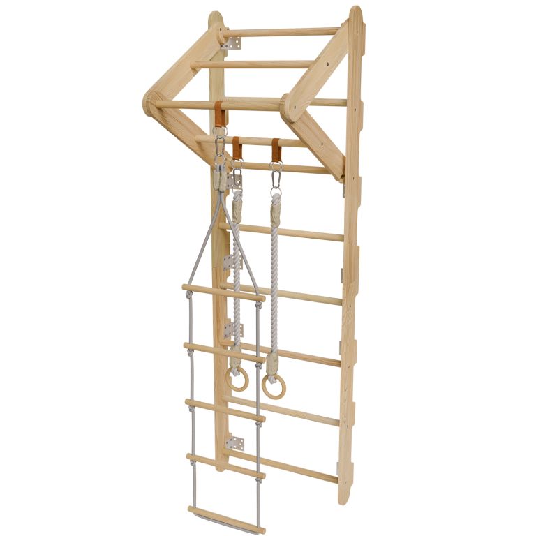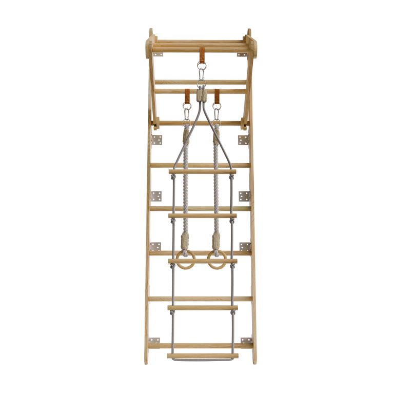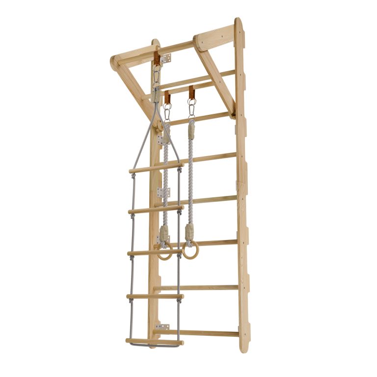 Přírodní materiál a stabilní konstrukce zajišťují vysokou odolnost a bezpečnost při používání. Kompaktní rozměry jsou ideální i do menších interiérů. Hrazda s trojúhelníkem, kruhy a žebřík jsou snadno odnímatelné a lze je libovolně střídat. Díky pevné montáži a kvalitním lanům vydrží žebřiny i aktivnější hru dětí od 3 do 12 let.