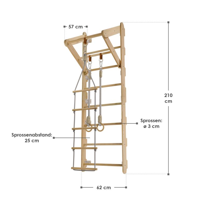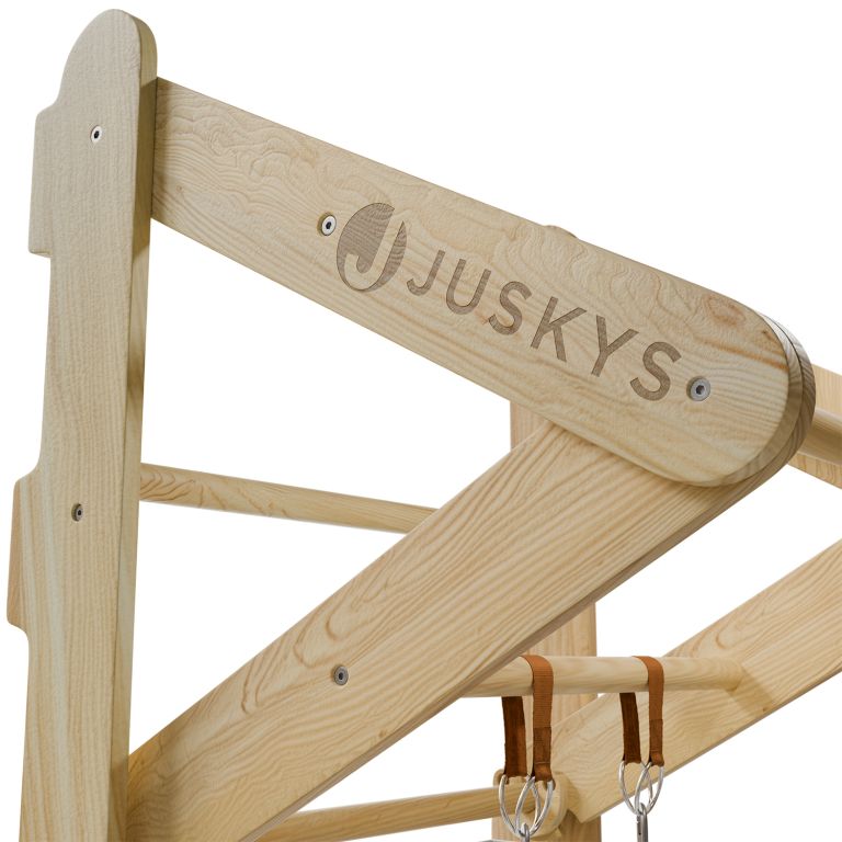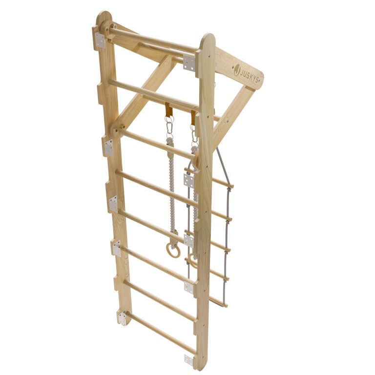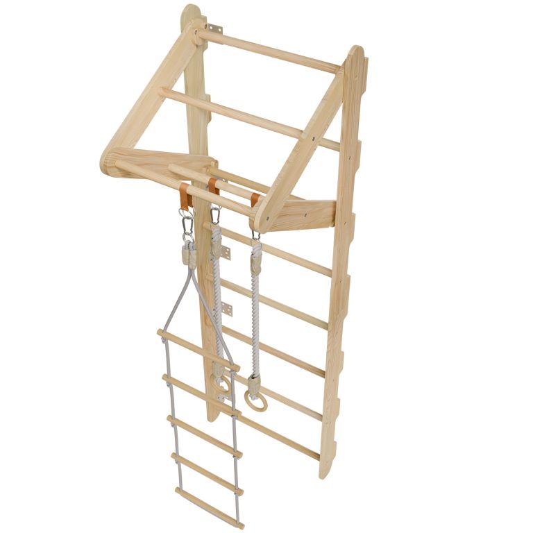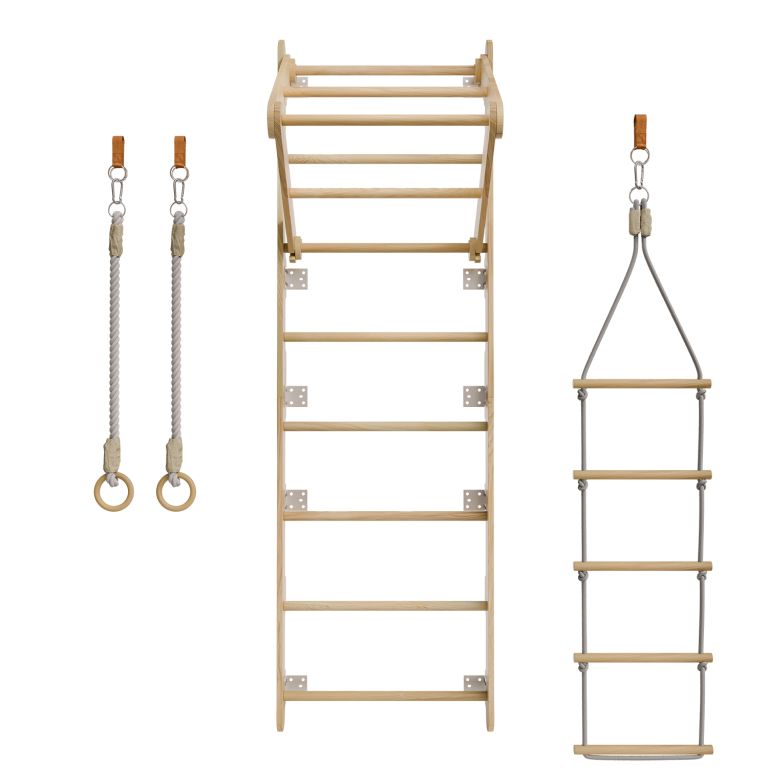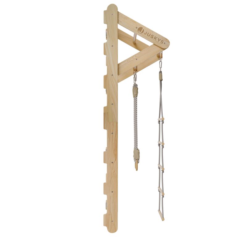 Přírodní materiál a stabilní konstrukce zajišťují vysokou odolnost a bezpečnost při používání. Kompaktní rozměry jsou ideální i do menších interiérů. Hrazda s trojúhelníkem, kruhy a žebřík jsou snadno odnímatelné a lze je libovolně střídat. Díky pevné montáži a kvalitním lanům vydrží žebřiny i aktivnější hru dětí od 3 do 12 let.