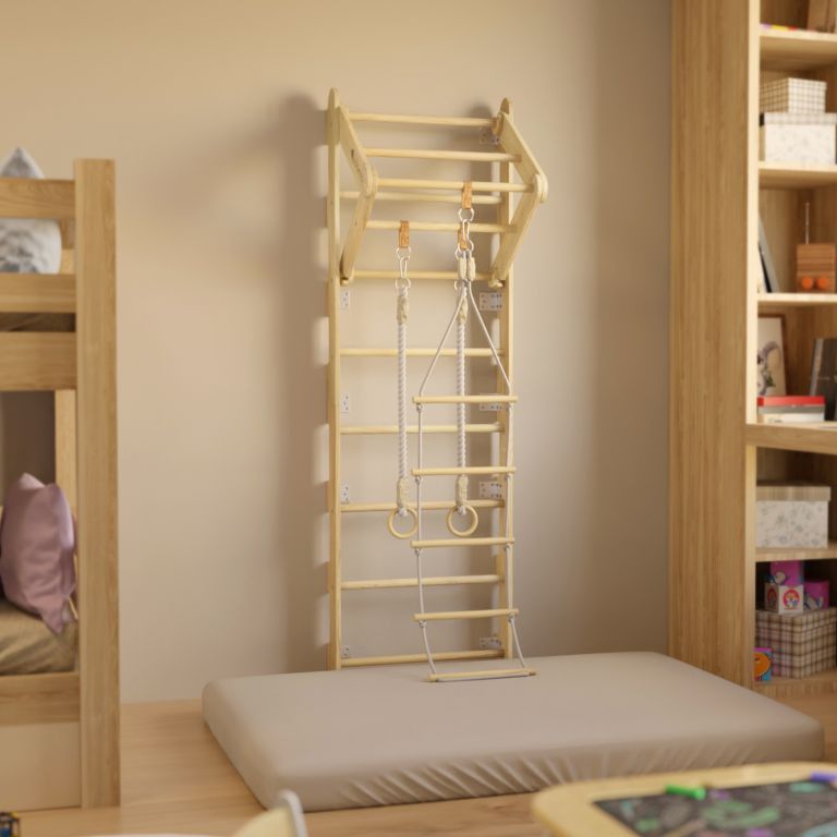 Proměňte dětský pokoj v prostor plný pohybu, zábavy a fantazie. Tyto dřevěné žebřiny s příslušenstvím nabízejí dětem bezpečný prostor pro lezení, posilování i hraní. Díky závěsné hrazdě, gymnastickým kruhům a provazovému žebříku si děti mohou každý den užít malé dobrodružství, které navíc rozvíjí koordinaci a sílu.