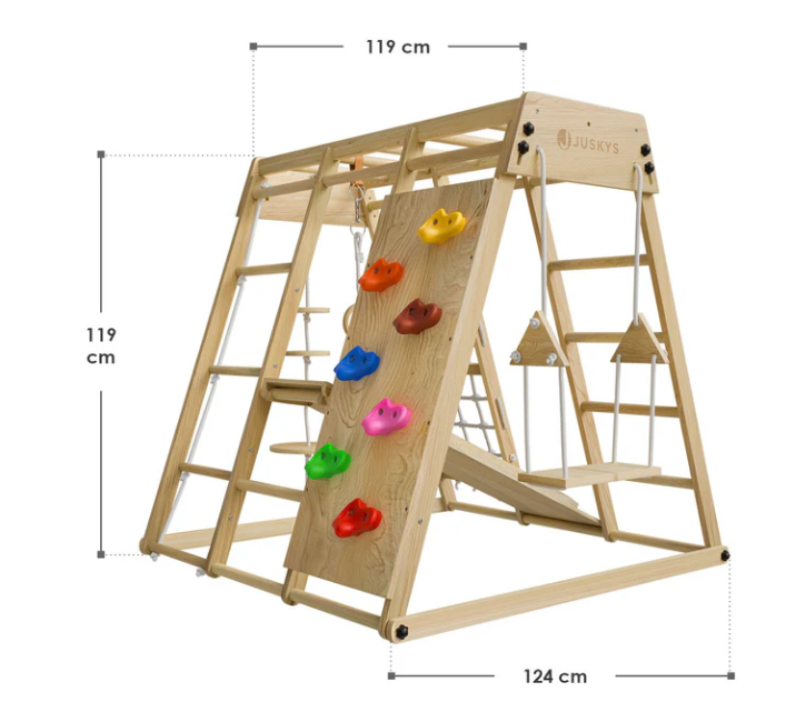Celá sestava je vyrobená z pevného borovicového dřeva a překližky, takže zvládne až 150 kg zátěže – hrát si může i více dětí současně. V balení najdete bohaté příslušenství: skluzavku, lezeckou stěnu, houpačku, gymnastické kruhy, síť, provazový žebřík i talířovou houpačku. Výška 119 cm je navržená tak, aby děti mohly bezpečně rozvíjet sílu, obratnost i pohybovou koordinaci přímo doma.