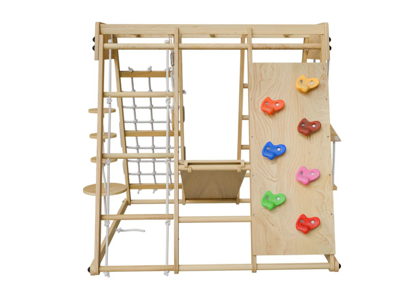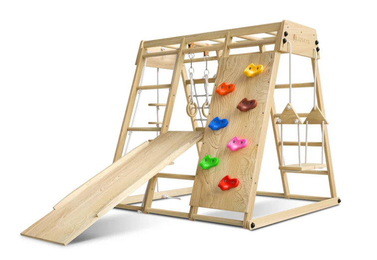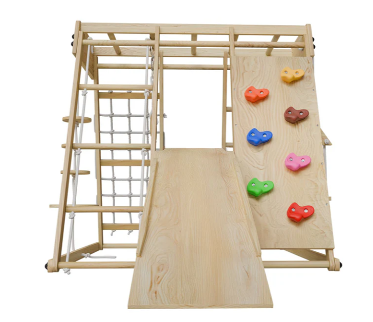 Proměňte pokoj v dobrodružné hřiště. Dřevěná prolézačka nabízí skluzavku, houpačku, žebřík i lezeckou stěnu.