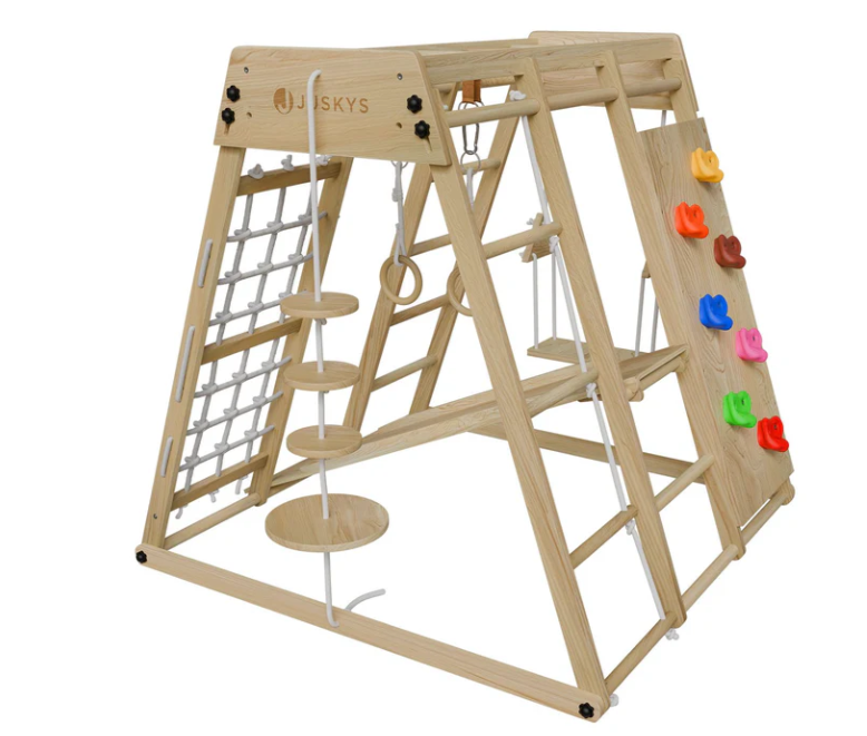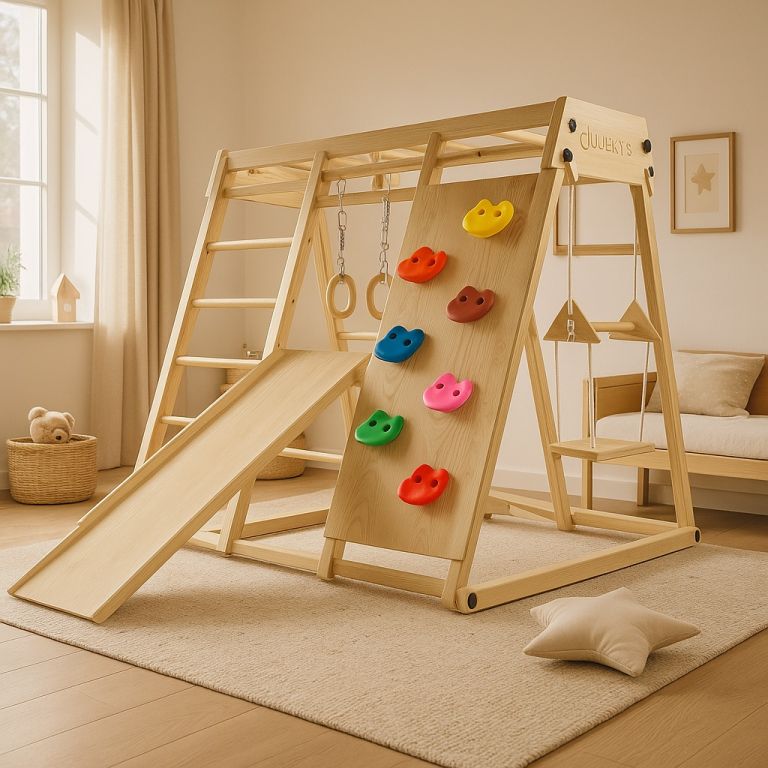 Představte si dětský pokoj, který se během chvilky změní v malé dobrodružné hřiště. Tato dřevěná prolézačka dětem nabídne vše, co je baví – mohou šplhat po barevných chytech na lezecké stěně, sjet si skluzavku, zhoupnout se na houpačce nebo trénovat rovnováhu na provazovém žebříku. Díky kompaktním rozměrům se hodí i do menších místností a když je potřeba uvolnit prostor, jednoduše ji složíte.