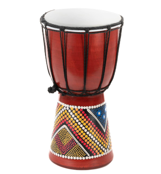 Malý djembe z mahagonu s kozí kůží, ideální pro děti i na cesty. Ručně malovaný, každý kus originál.