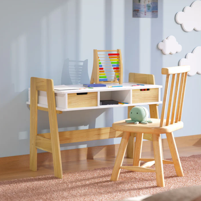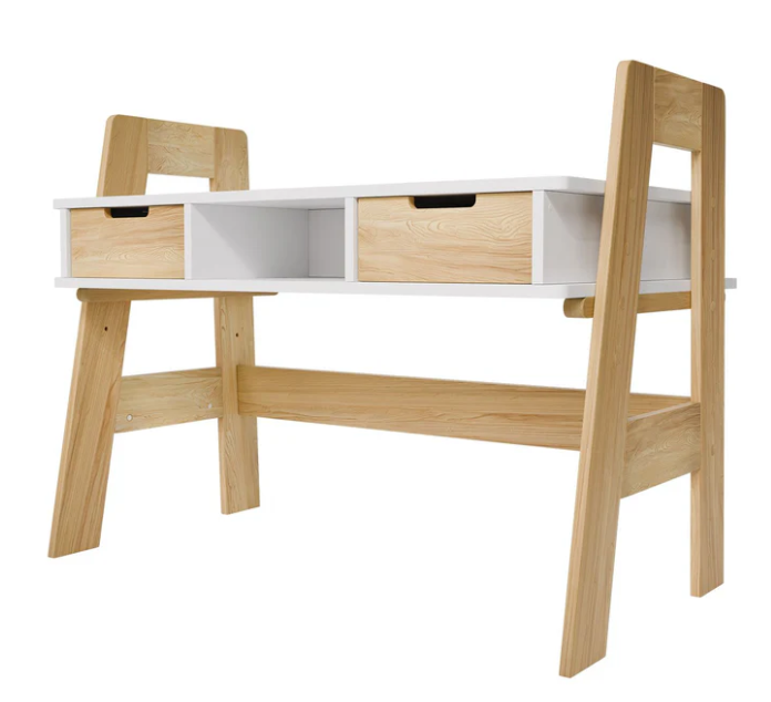 Robustní konstrukce z odolného dřeva s melaminovou úpravou zajišťuje dlouhou životnost a snadnou údržbu. Čtyři prostorné přihrádky a dvě zásuvky nabízí dostatek místa na školní potřeby i výtvarné pomůcky. Výškově nastavitelná pracovní deska se snadno přizpůsobí potřebám rostoucího dítěte.