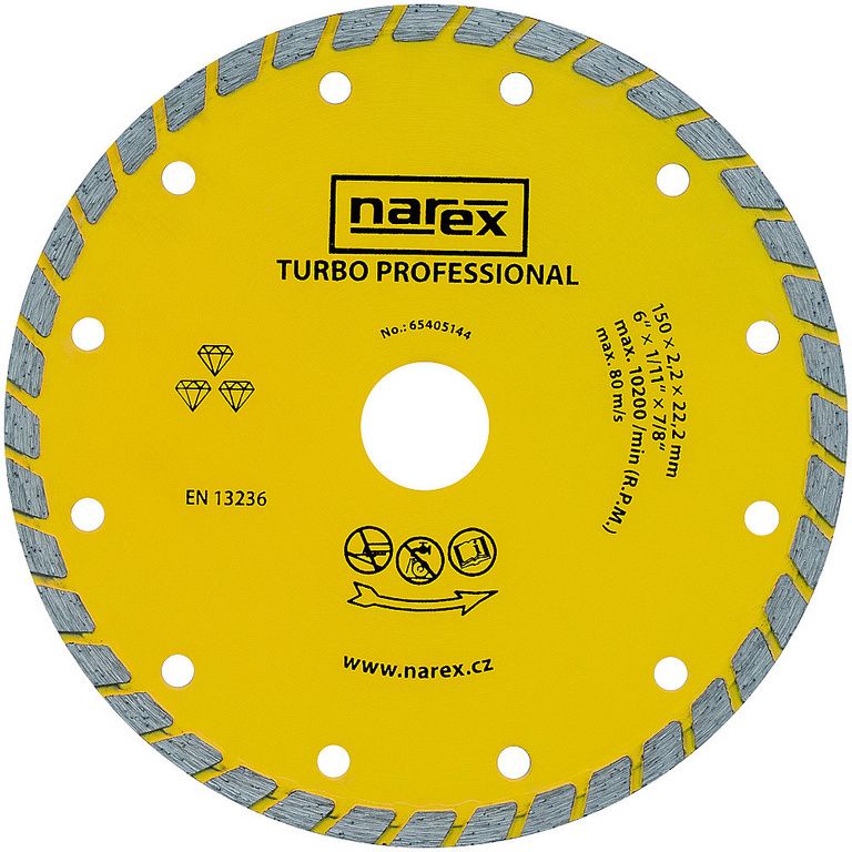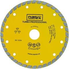 Diamantový kotouč Narex Turbo Professional pro použití s úhlovými bruskami zastane mnoho práce. Rozřízne veškerý stavební materiál, jako jsou cihly, dlaždice, beton nebo asfalt. Celoobvodový kotouč se šikmým segmentem a tenkým ocelovým tělem pro řezání za sucha a pro rychlé a čisté řezy bez otřepů nebo zabarvení. Při práci vždy používejte rukavice, brýle, roušku a sluchátka. Dbejte zvýšené opatrnosti, neboť kov se při řezání rozžhaví.