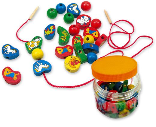 Praktická plastová dóza s uzávěrem plná barevných dřevěných korálků, jednoduchých i s obrázky, a se šňůrkami s dřevěnými koncovkami pro snadnější navlékání. K nácviku motoriky a podpoře fantazie.