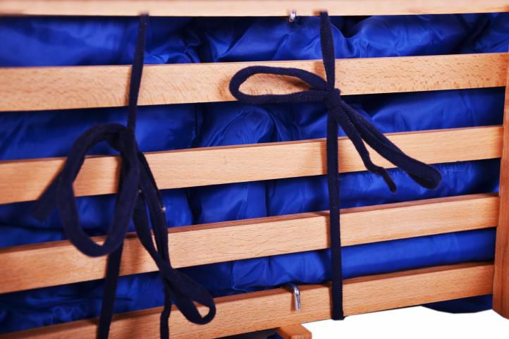 Dřevěné sáňky s ohrádkou a modrým fusakem, 100 cm