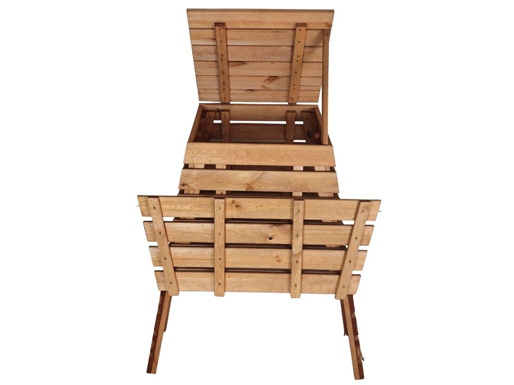 Kompostér je vyrobený v české truhlárně z masivního borovicového dřeva a ošetřený přírodním olejem, který prodlužuje jeho životnost. Objem 430 litrů poskytuje dost prostoru pro trávu, listí i kuchyňské zbytky. Stabilní konstrukce vydrží roky a praktické víko s otevíratelnou přední částí usnadní přístup k obsahu i odebírání hotového kompostu.