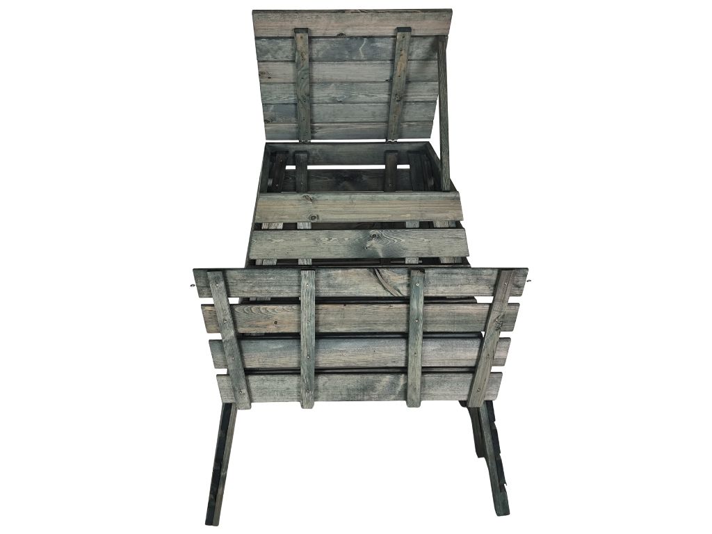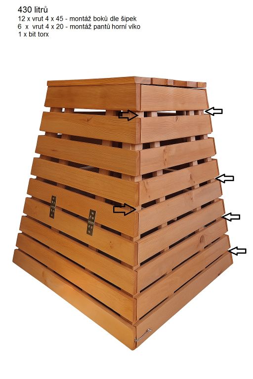 Kompostér je vyrobený v české truhlárně z masivního borovicového dřeva a ošetřený přírodním olejem, který prodlužuje jeho životnost. Objem 430 litrů poskytuje dost prostoru pro trávu, listí i kuchyňské zbytky. Stabilní konstrukce vydrží roky a praktické víko s otevíratelnou přední částí usnadní přístup k obsahu i odebírání hotového kompostu.
