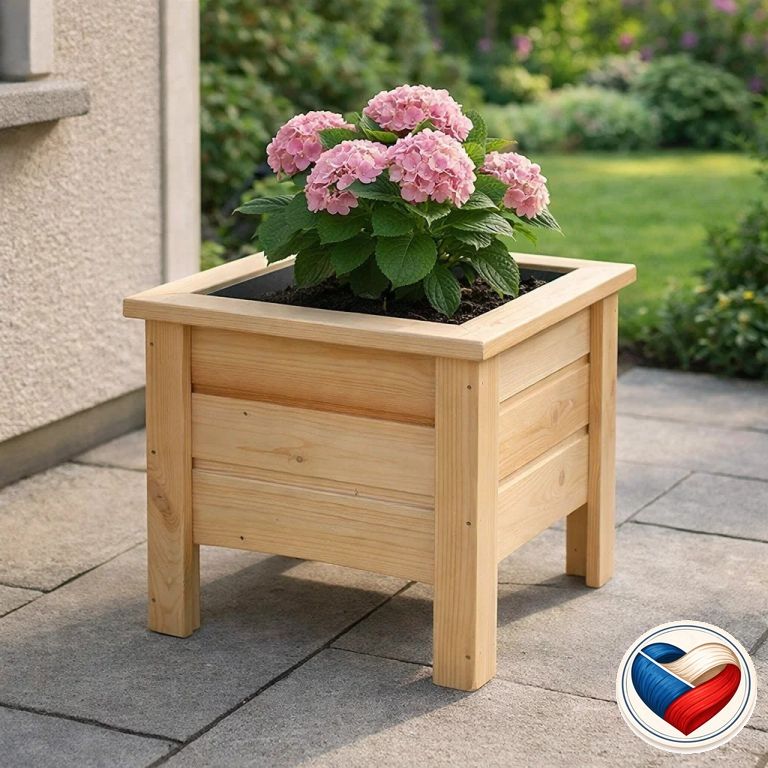 Květník na nohách pro terasu i ke vchodu, s odtokem vody a textilií. Ruční výroba z české truhlárny v Krušných horách.