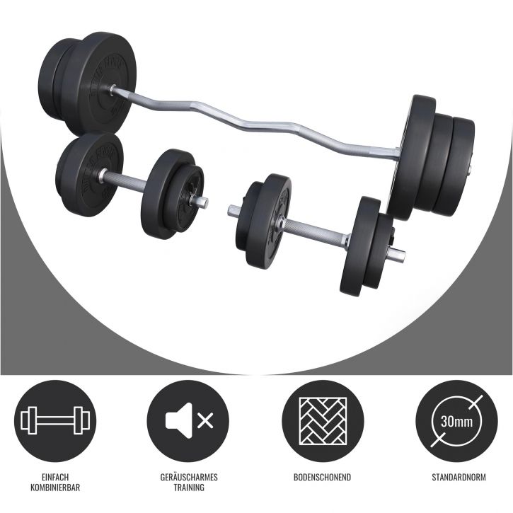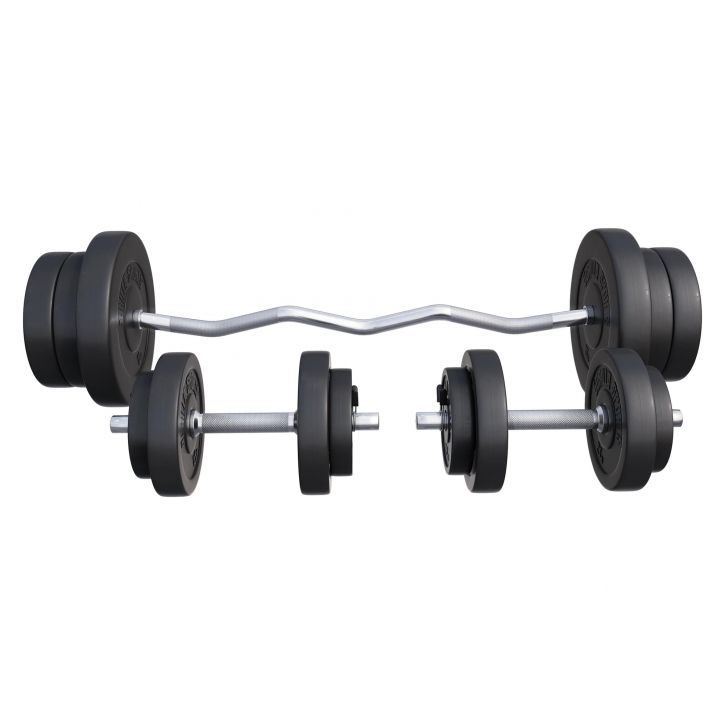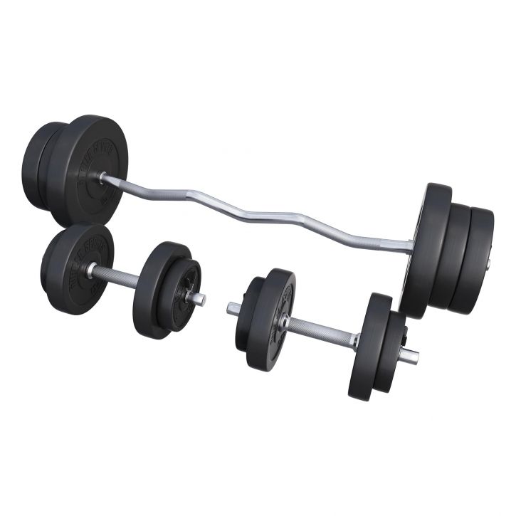Sada obsahuje různé kotouče a činkové tyče. Kotouče si nasadíte podle potřeby a můžete hned začít s tréninkem. Chromová SZ činková tyč o délce 120 cm je vybavena praktickými pružinovými pojistkami pro zajištění zátěžových kotoučů. Tyč činky je v oblasti úchopu žebrovaná, což zaručuje dobrý úchop. Tato tyč na činky je vhodná pro všechna závaží s průměrem otvoru 30/31 mm.