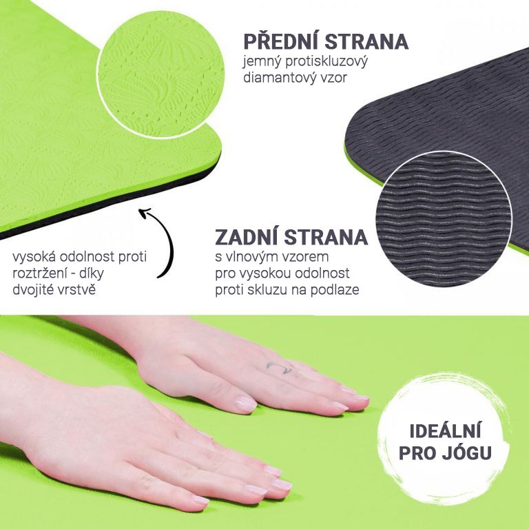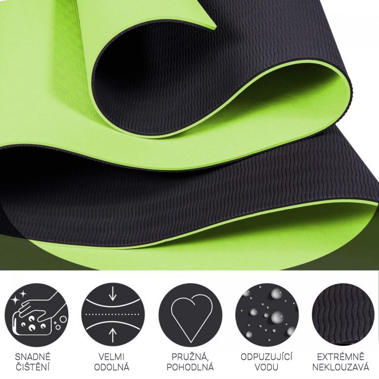 Tato podložka je ideální pro jógu, pilates a nebo gymnastiku. Uklidňující barvy podložky na jógu se uplatní zejména při skupinovém cvičení na podlaze. Po tréninku je můžete naskládat srolované na sebe. Díky černé straně je při rozbalování na první pohled vidět, která strana patří na zem a pokud si ji chcete vzít s sebou na trénink do přírody, je to bez problémů možné jelikož je lehká a snadno přenosná. Vyrobeno z měkkého materiálu, který je šetrný k pokožce.