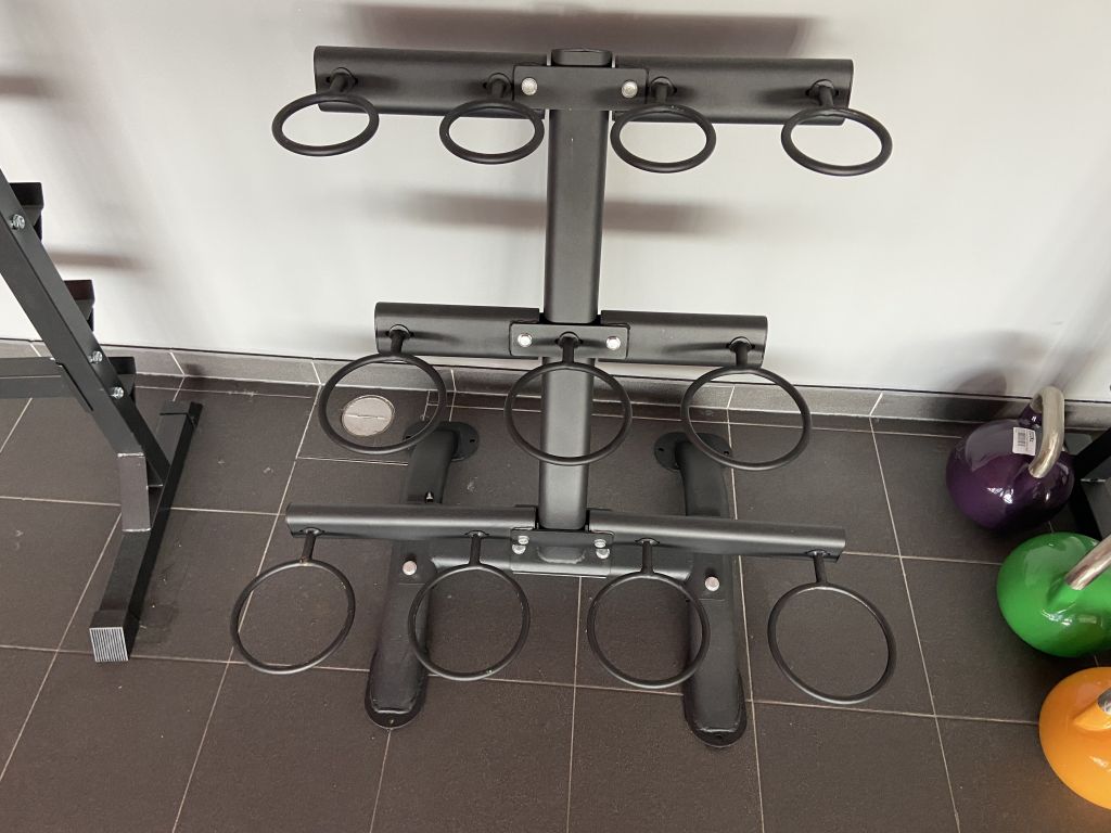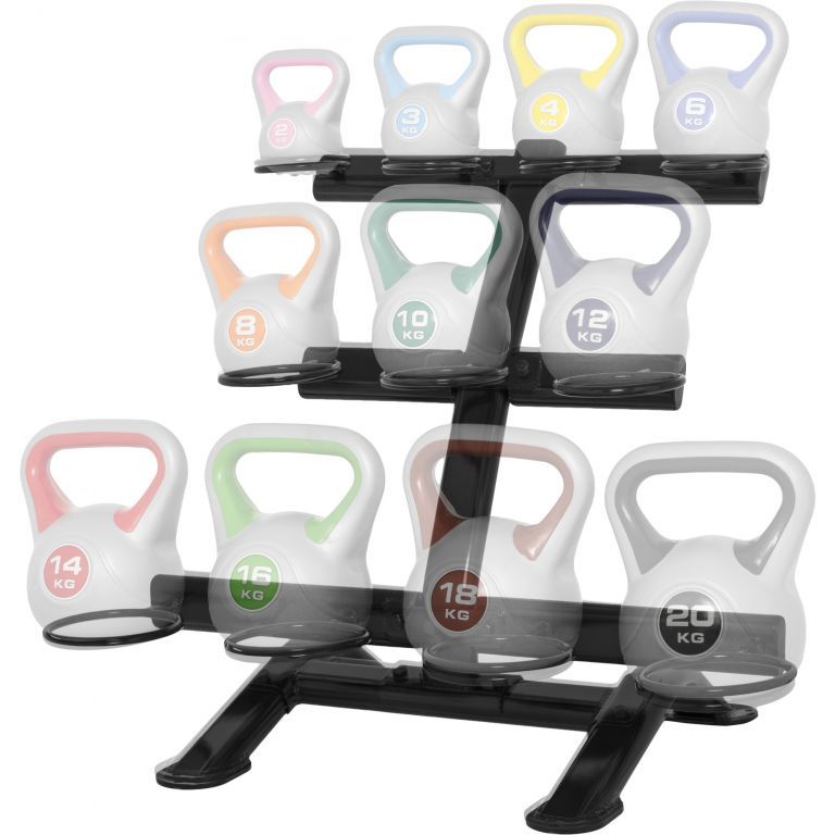 Stojan na kettlebelly od Gorilla Sports s jedenácti úložnými kruhy na třech úrovních je ideálním místem pro uložení Vašich kettlebellů. Černý stojan na kettlebelly potěší svým atraktivním designem a je vhodný pro kettlebelly všech standardních velikostí. Jedenáct kettlebellů najde své optimální místo ve svých třech řadách. Kroužky vám umožní bezpečně uložit kettlebelly a získáte další prostor. Nepostradatelné pro kettlebelly bez plochého dna.