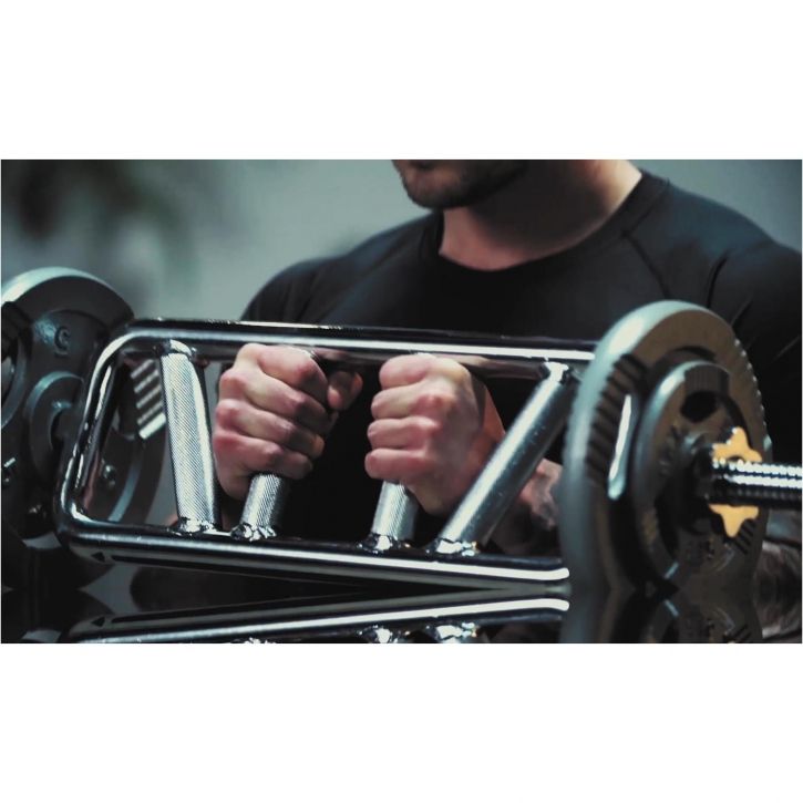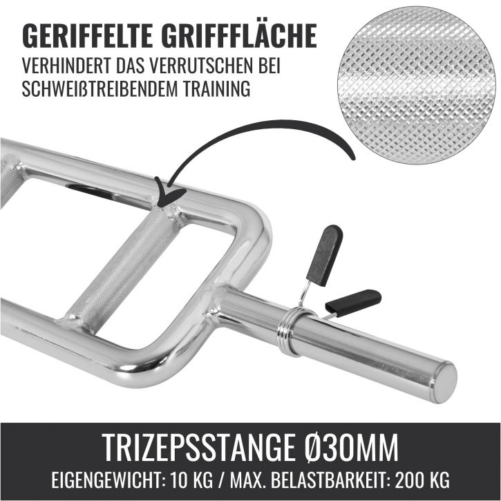 Univerzální tyč od Gorilla Sports je ideálním vybavením pro cílený trénink tricepsů. Její paralelní rukojeti umožňují přirozenou polohu rukou, která je šetrná k vašim kloubům. Vroubkování rukojetí zajistí pevný úchop za jakýchkoliv okolností. Přiložené zámky drží závaží pevně na místě.