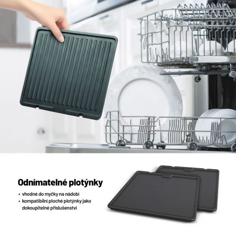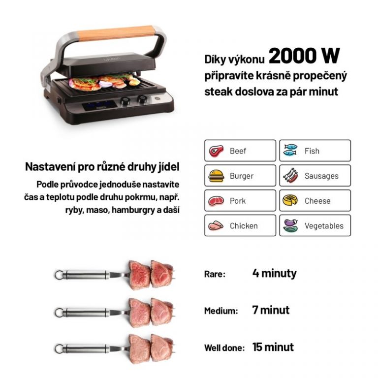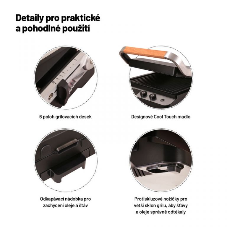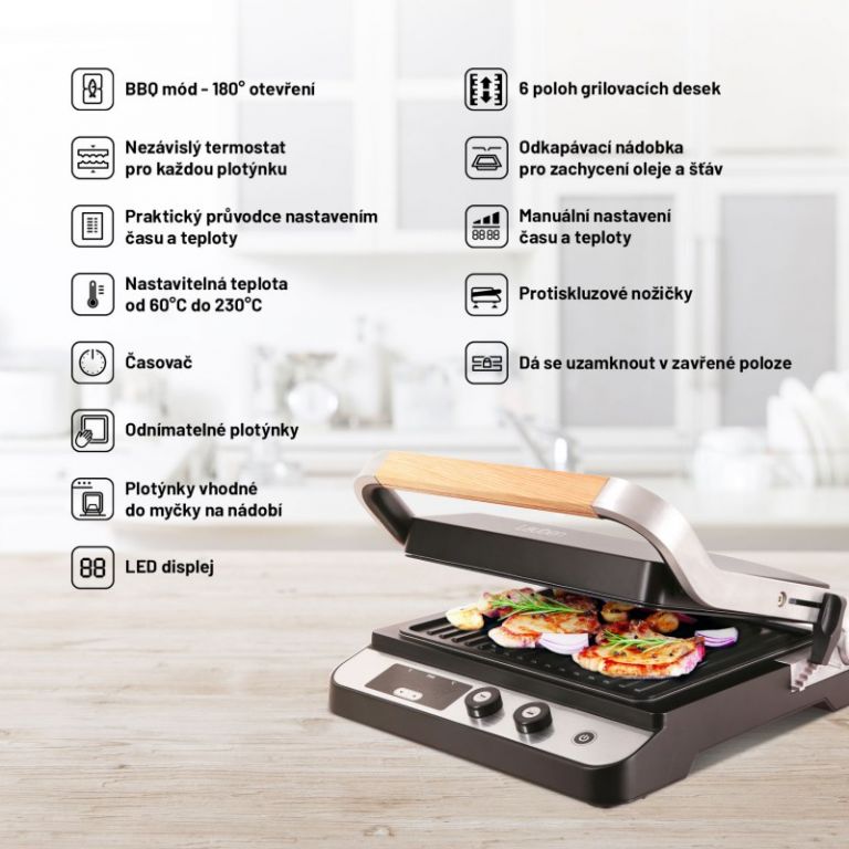 Díky výkonu 2000 W si gril bez problému poradí i s prudkým opečením, které je potřeba u kvalitních steaků, má dostatečnou grilovací plochou 1500 cm2, regulátor teploty a časovač. Plotýnky grilu jsou odnímatelné, každé z nich můžete separátně nastavit teplotu ohřevu a vy tak můžete připravovat různé druhy potravin zároveň. Teplota ohřevu je nastavitelná v rozmezí od 60 do 230 °C. Součástí grilu je praktická miska na odkapávání přebytečného tuku a šťávy. Příjemným bonusem je kvalitní designové provedení vhodné do exteriéru i interiéru.