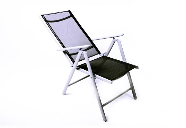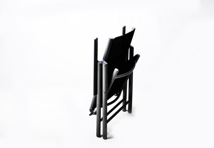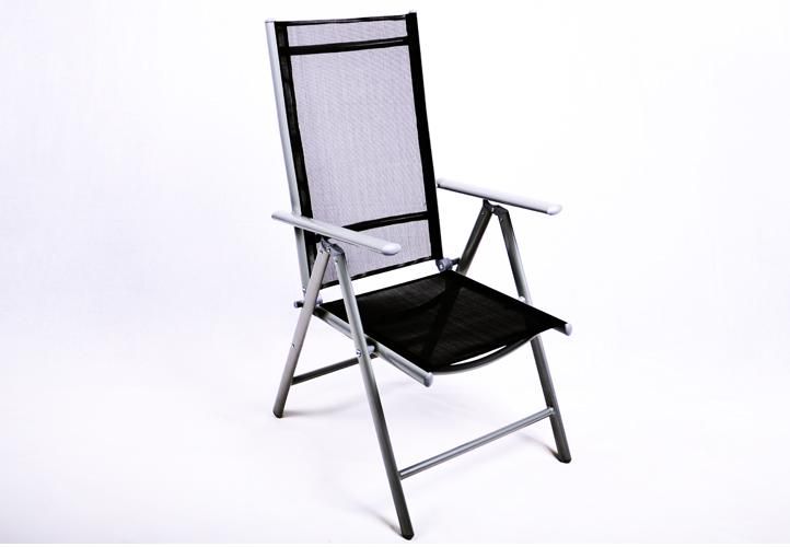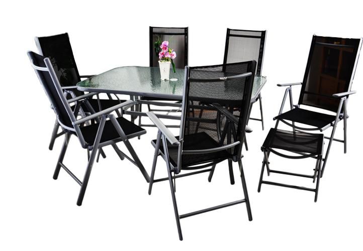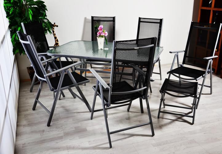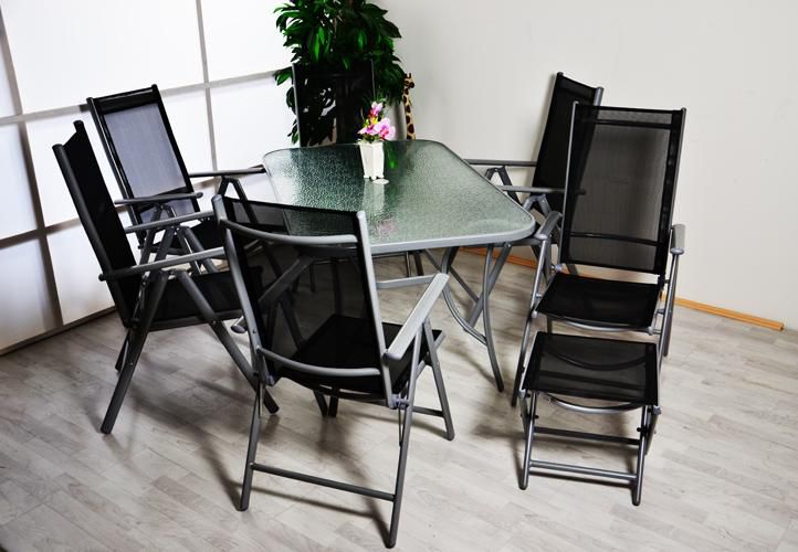 Hliník/ocelová konstrukce, černá barva, sklopné židle, skleněná deska