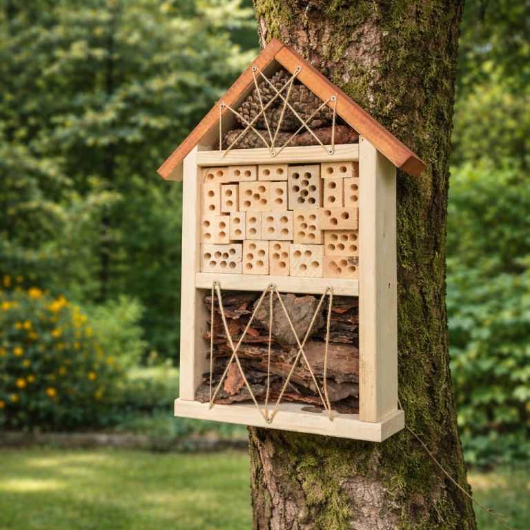 Hmyzí hotel se doporučuje umístit výše od země, nejlépe na strom nebo zeď.
