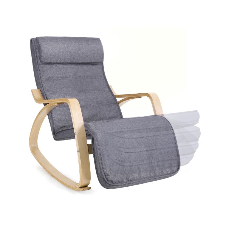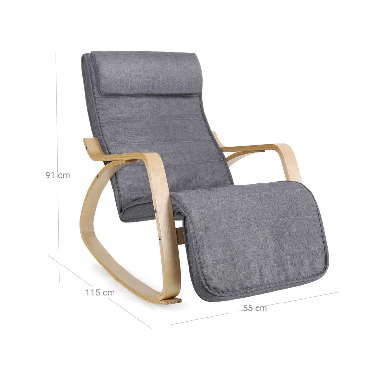 Objevte relaxační houpací křeslo v elegantní šedé barvě s nastavitelnou podnožkou a nosností až 150 kg.